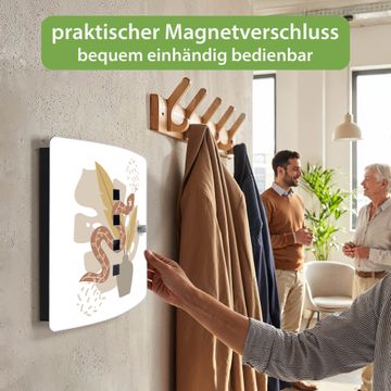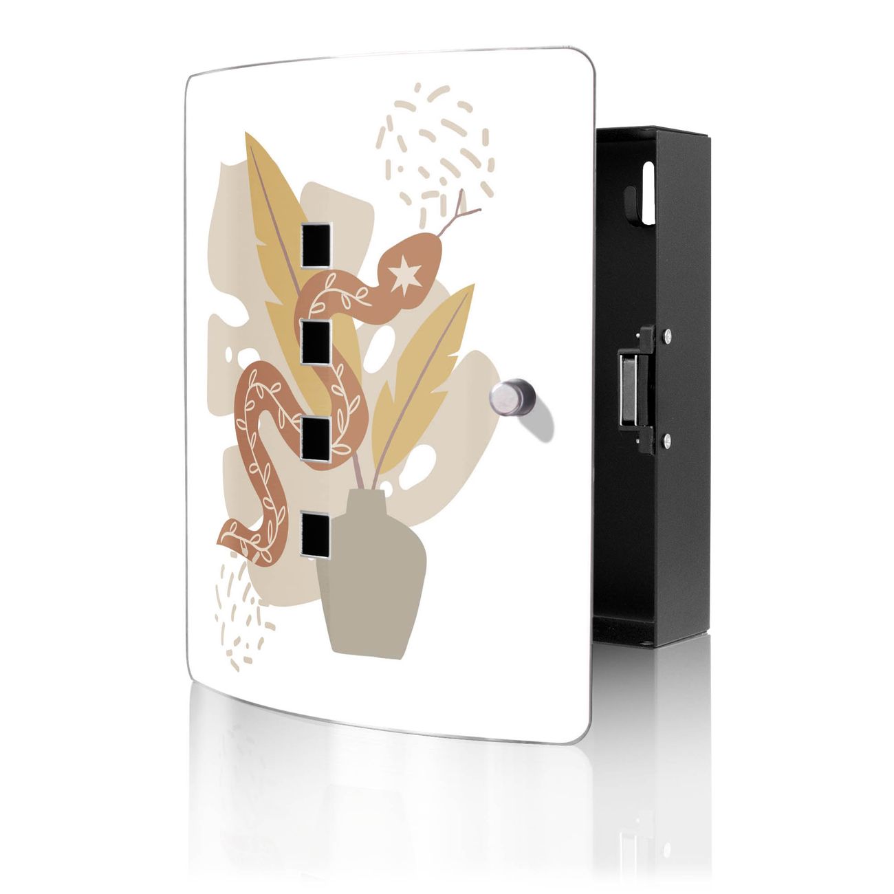 Funktion / Nutzen: Die leicht geschwungene Edelstahltür ist mit einer hochwertigen Motivfolie und dem Motiv Motiv Boho Schlange Vase kaschiert. Ein praktischer Magnetverschluss ermöglicht Ihnen ein schnelles Öffnen und Schließen. Befestigt wird der Schlüsselkasten an 2 Stellen auf der Rückseite, passendes Montagematerial fügen wir bereits bei.