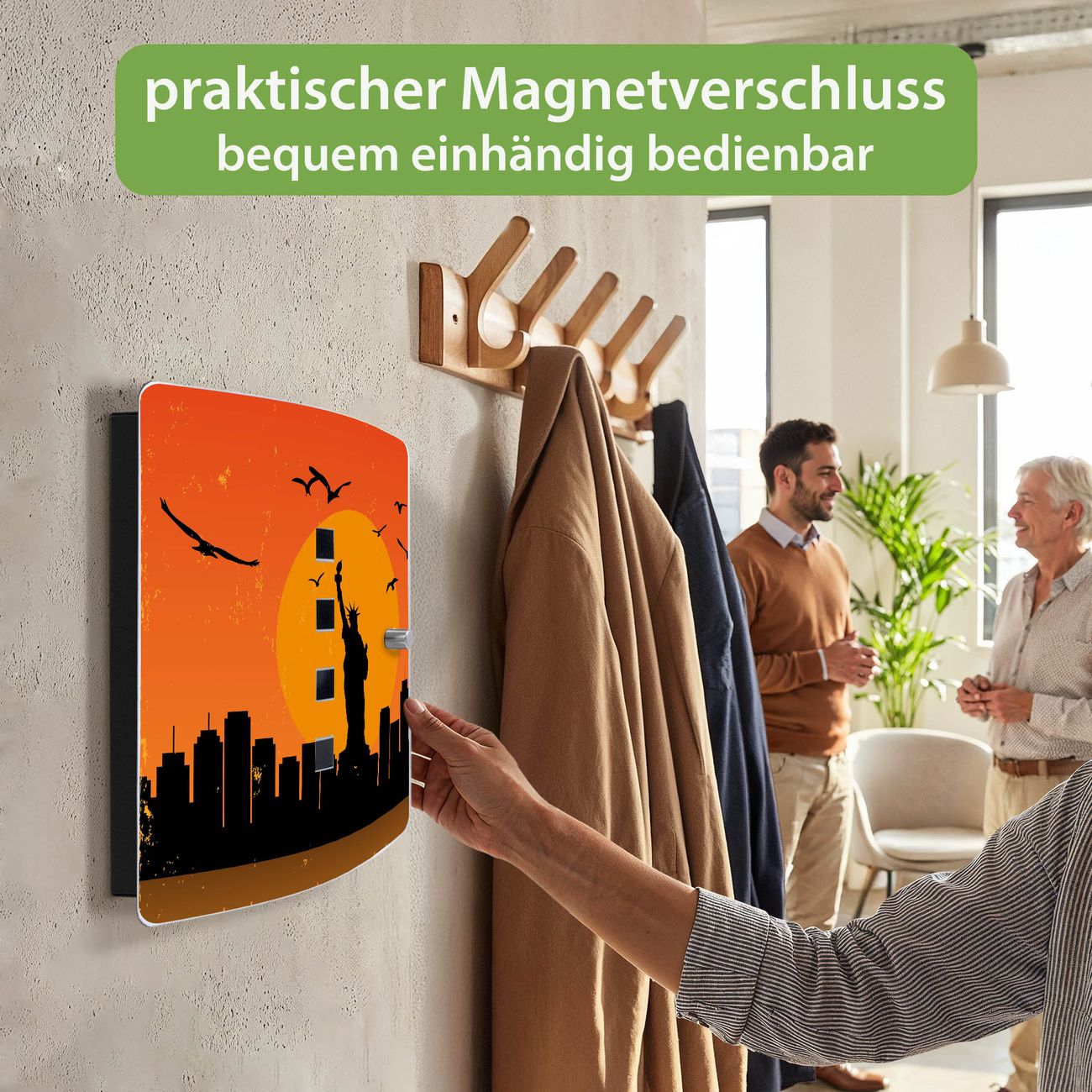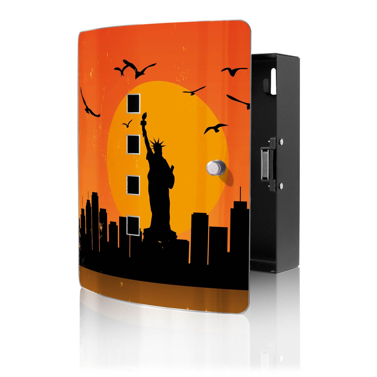 Funktion / Nutzen: Die leicht geschwungene Edelstahltür ist mit einer hochwertigen Motivfolie und dem Motiv Motiv City Poster New York kaschiert. Ein praktischer Magnetverschluss ermöglicht Ihnen ein schnelles Öffnen und Schließen. Befestigt wird der Schlüsselkasten an 2 Stellen auf der Rückseite, passendes Montagematerial fügen wir bereits bei.