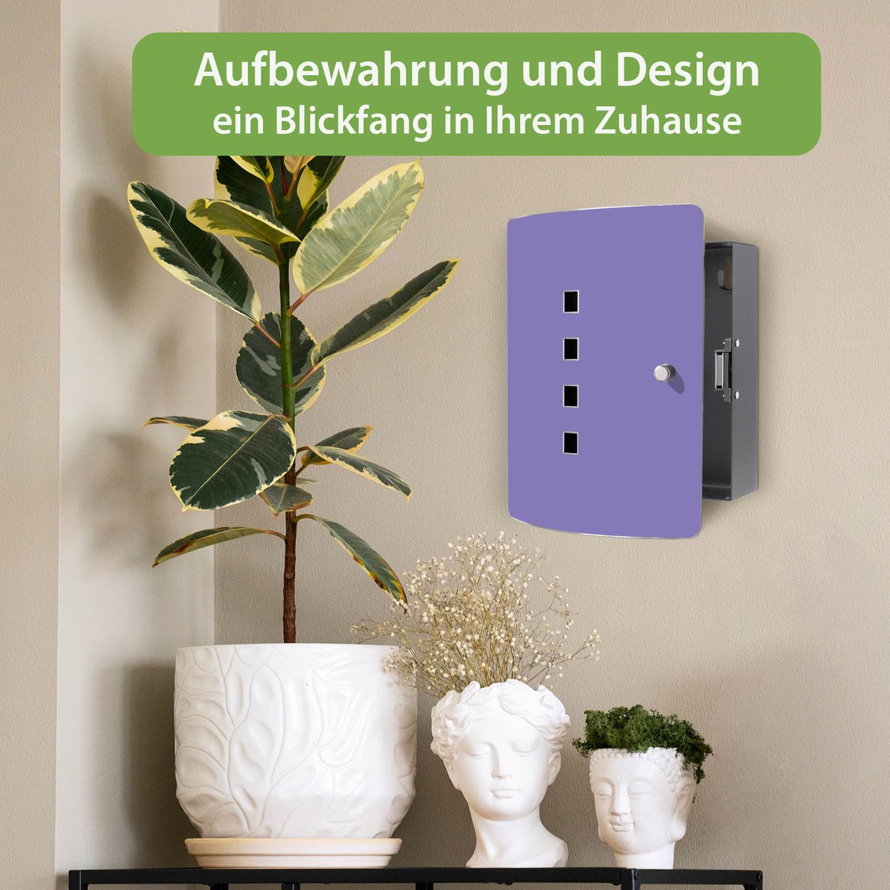 Funktion / Nutzen: Die leicht geschwungene Edelstahltür ist mit einer hochwertigen Motivfolie und dem Motiv Farbe Lavendel kaschiert. Ein praktischer Magnetverschluss ermöglicht Ihnen ein schnelles Öffnen und Schließen. Befestigt wird der Schlüsselkasten an 2 Stellen auf der Rückseite, passendes Montagematerial fügen wir bereits bei.