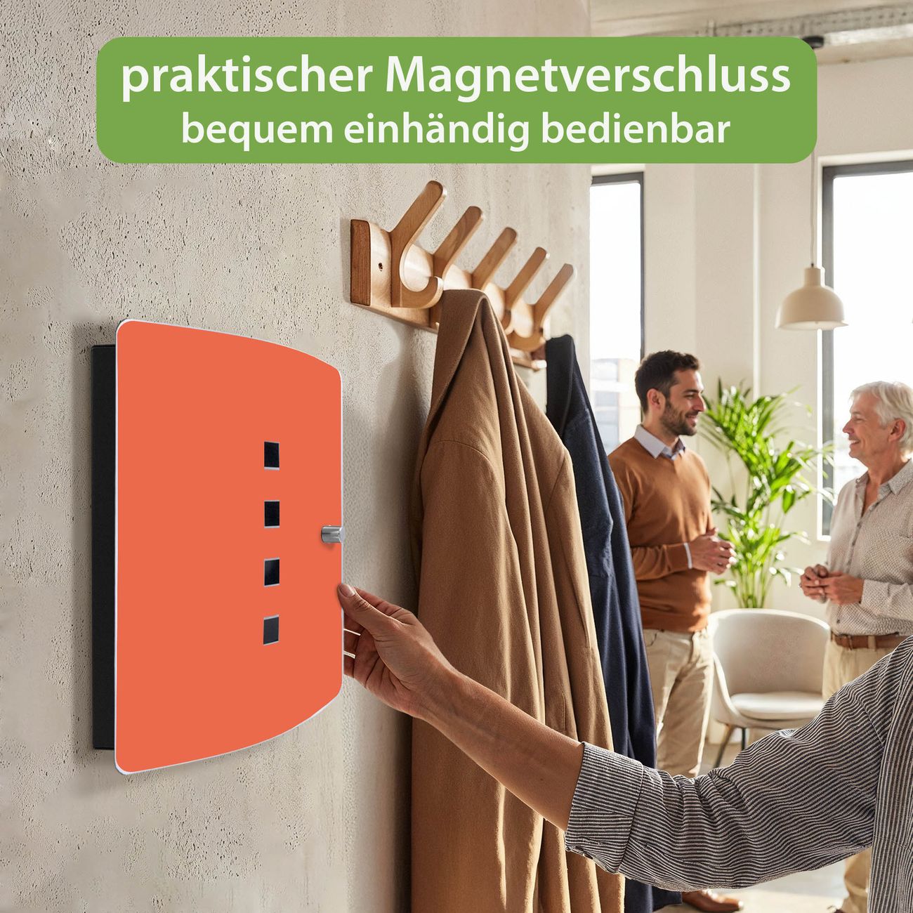 Funktion / Nutzen: Die leicht geschwungene Edelstahltür ist mit einer hochwertigen Motivfolie und dem Motiv Farbe Orange kaschiert. Ein praktischer Magnetverschluss ermöglicht Ihnen ein schnelles Öffnen und Schließen. Befestigt wird der Schlüsselkasten an 2 Stellen auf der Rückseite, passendes Montagematerial fügen wir bereits bei.