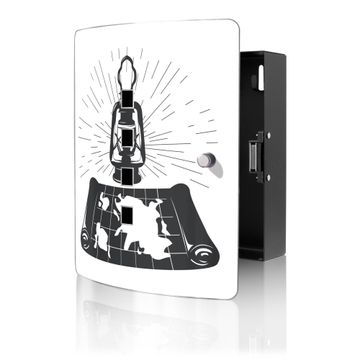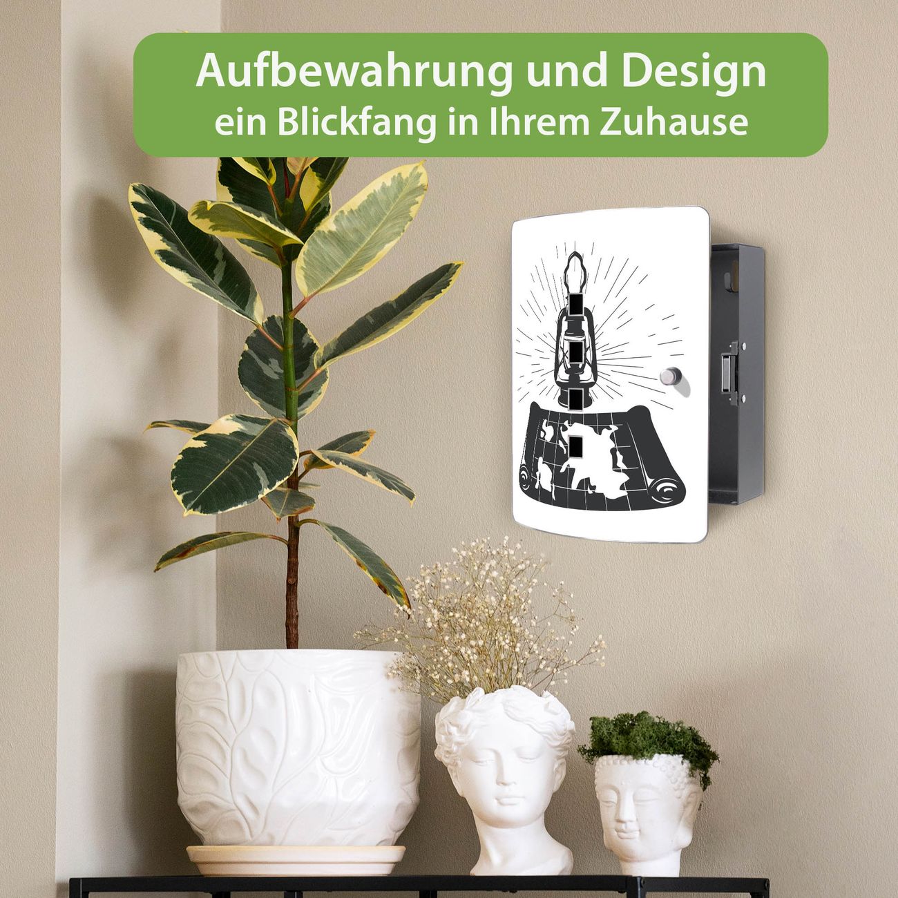 Funktion / Nutzen: Die leicht geschwungene Edelstahltür ist mit einer hochwertigen Motivfolie und dem Motiv Motiv Entdecker-Laterne kaschiert. Ein praktischer Magnetverschluss ermöglicht Ihnen ein schnelles Öffnen und Schließen. Befestigt wird der Schlüsselkasten an 2 Stellen auf der Rückseite, passendes Montagematerial fügen wir bereits bei.