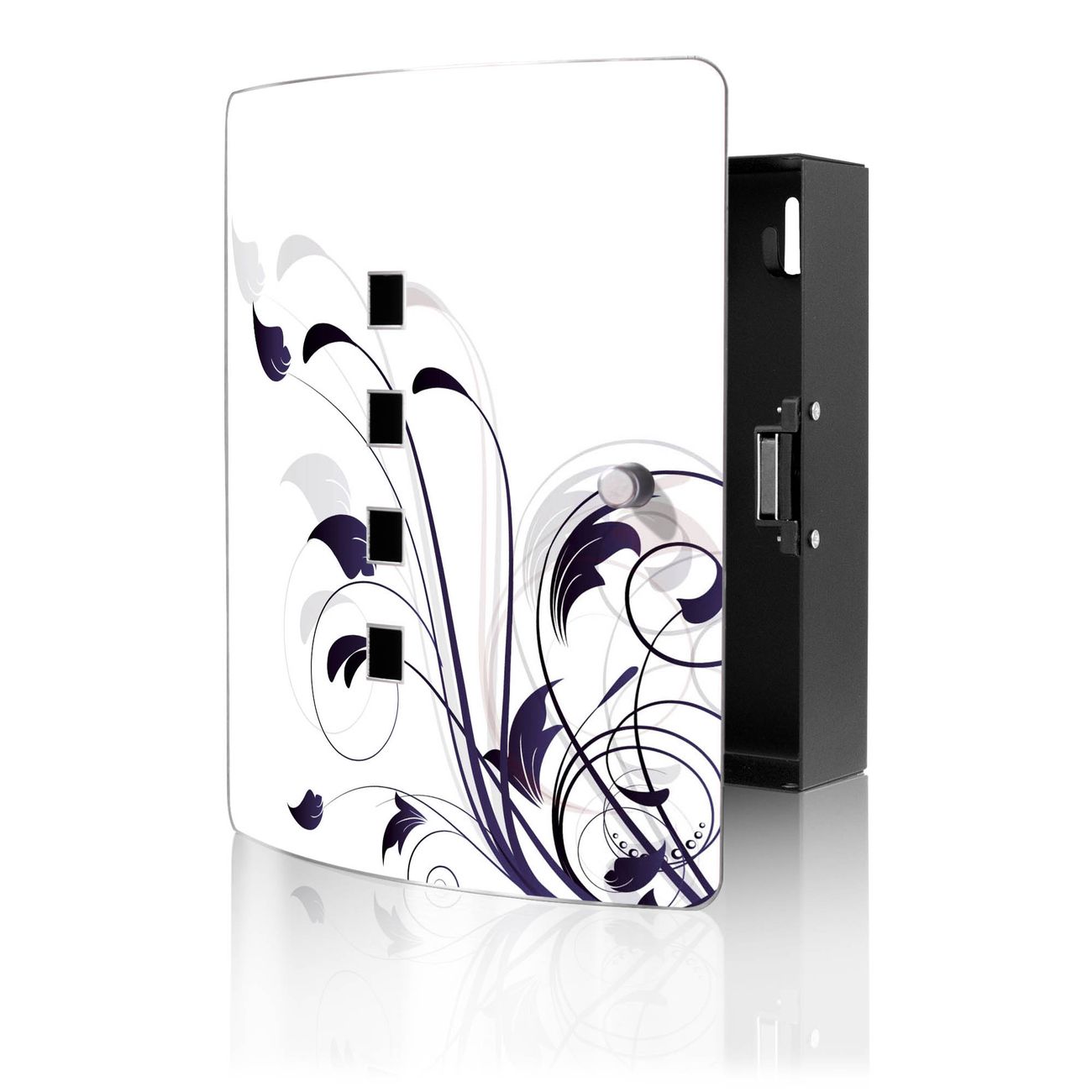 Funktion / Nutzen: Die leicht geschwungene Edelstahltür ist mit einer hochwertigen Motivfolie und dem Motiv Motiv Florale Eleganz kaschiert. Ein praktischer Magnetverschluss ermöglicht Ihnen ein schnelles Öffnen und Schließen. Befestigt wird der Schlüsselkasten an 2 Stellen auf der Rückseite, passendes Montagematerial fügen wir bereits bei.