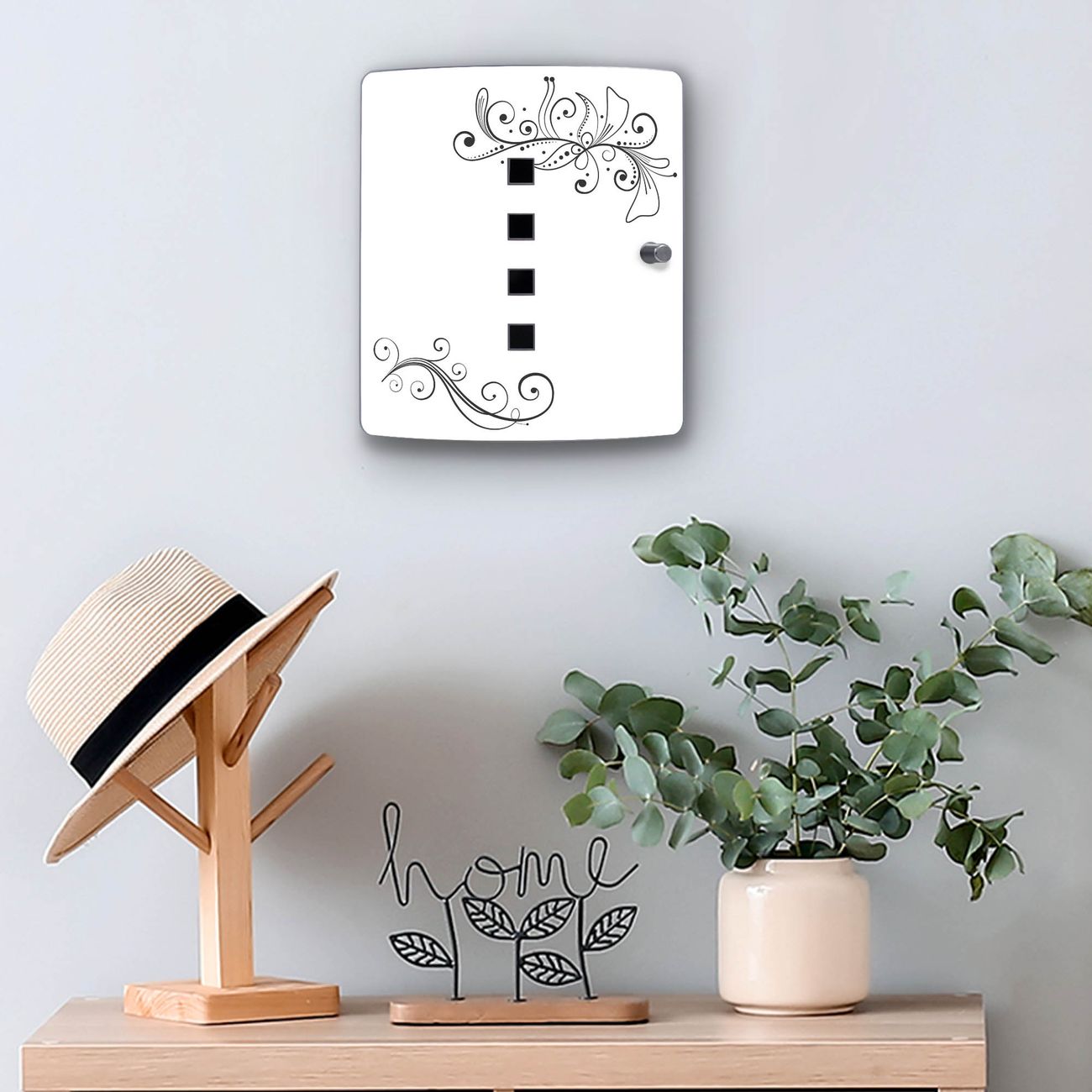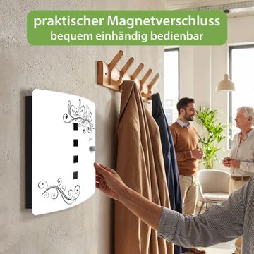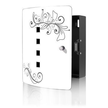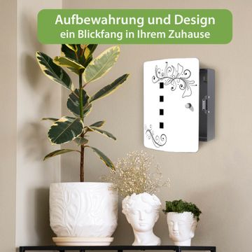 Funktion / Nutzen: Die leicht geschwungene Edelstahltür ist mit einer hochwertigen Motivfolie und dem Motiv Motiv Florales Ornament kaschiert. Ein praktischer Magnetverschluss ermöglicht Ihnen ein schnelles Öffnen und Schließen. Befestigt wird der Schlüsselkasten an 2 Stellen auf der Rückseite, passendes Montagematerial fügen wir bereits bei.