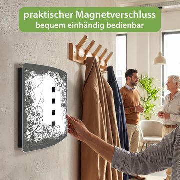 Funktion / Nutzen: Die leicht geschwungene Edelstahltür ist mit einer hochwertigen Motivfolie und dem Motiv Motiv Florales Schwarz-Weiß Muster kaschiert. Ein praktischer Magnetverschluss ermöglicht Ihnen ein schnelles Öffnen und Schließen. Befestigt wird der Schlüsselkasten an 2 Stellen auf der Rückseite, passendes Montagematerial fügen wir bereits bei.