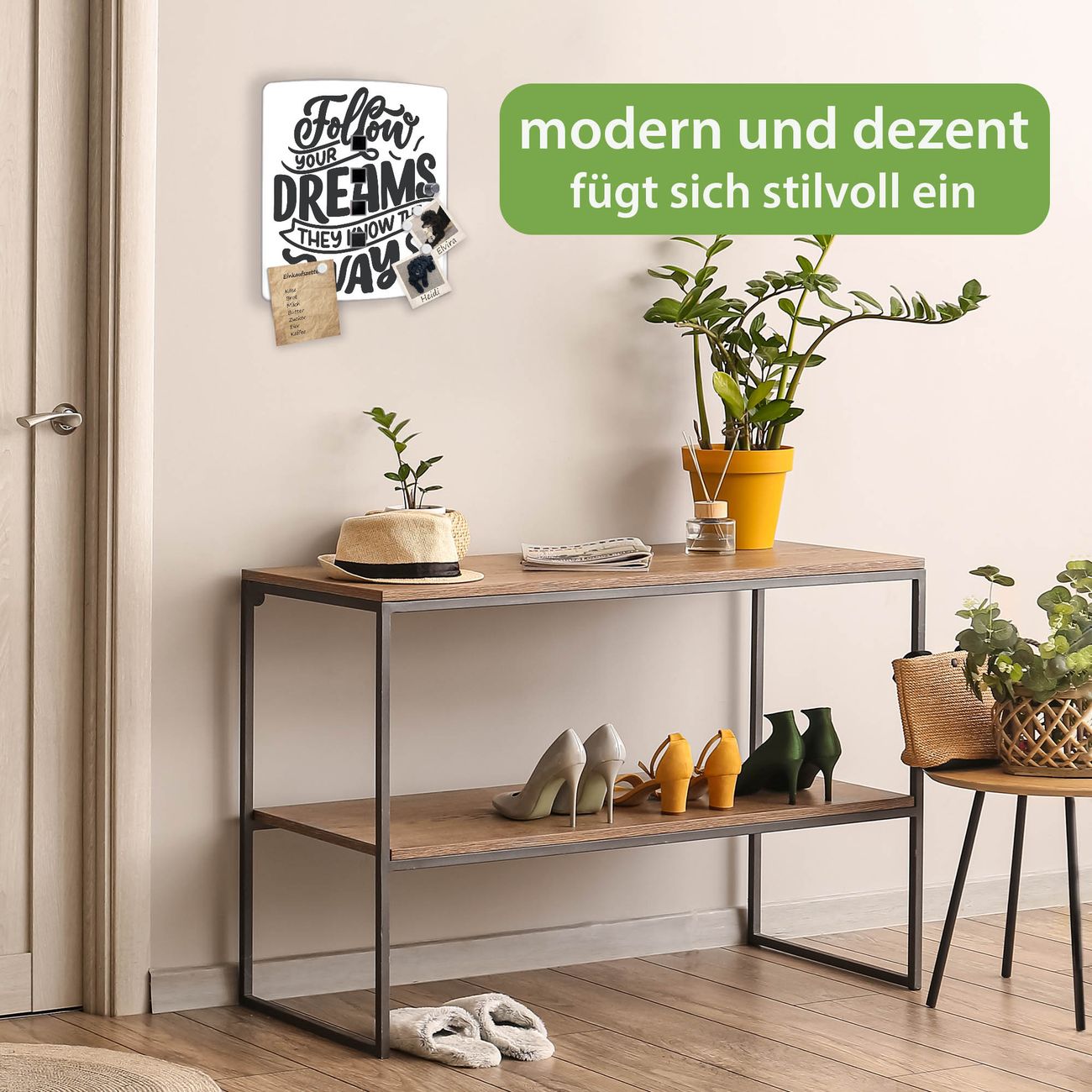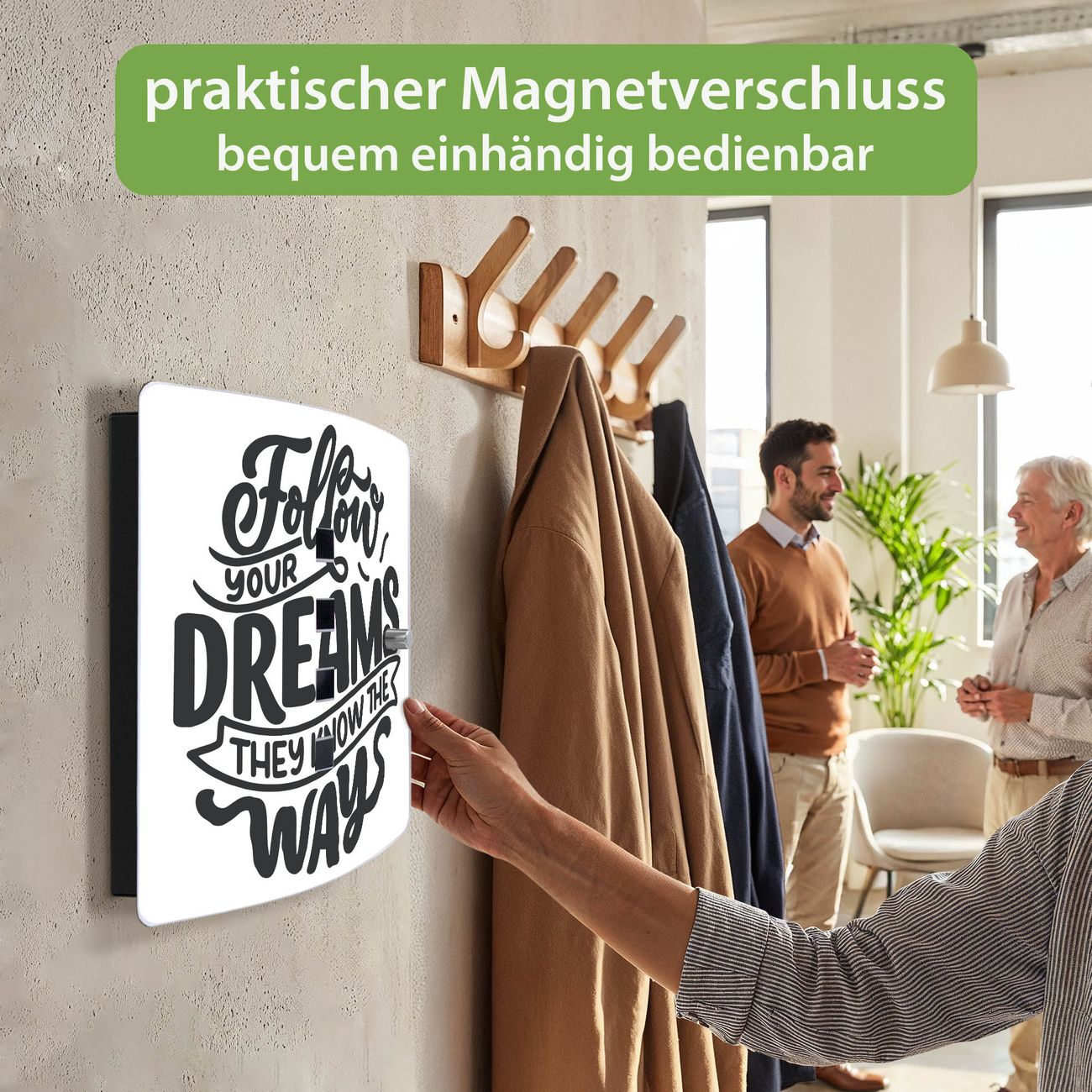Funktion / Nutzen: Die leicht geschwungene Edelstahltür ist mit einer hochwertigen Motivfolie und dem Motiv Motiv Follow your Dreams 2 kaschiert. Ein praktischer Magnetverschluss ermöglicht Ihnen ein schnelles Öffnen und Schließen. Befestigt wird der Schlüsselkasten an 2 Stellen auf der Rückseite, passendes Montagematerial fügen wir bereits bei.