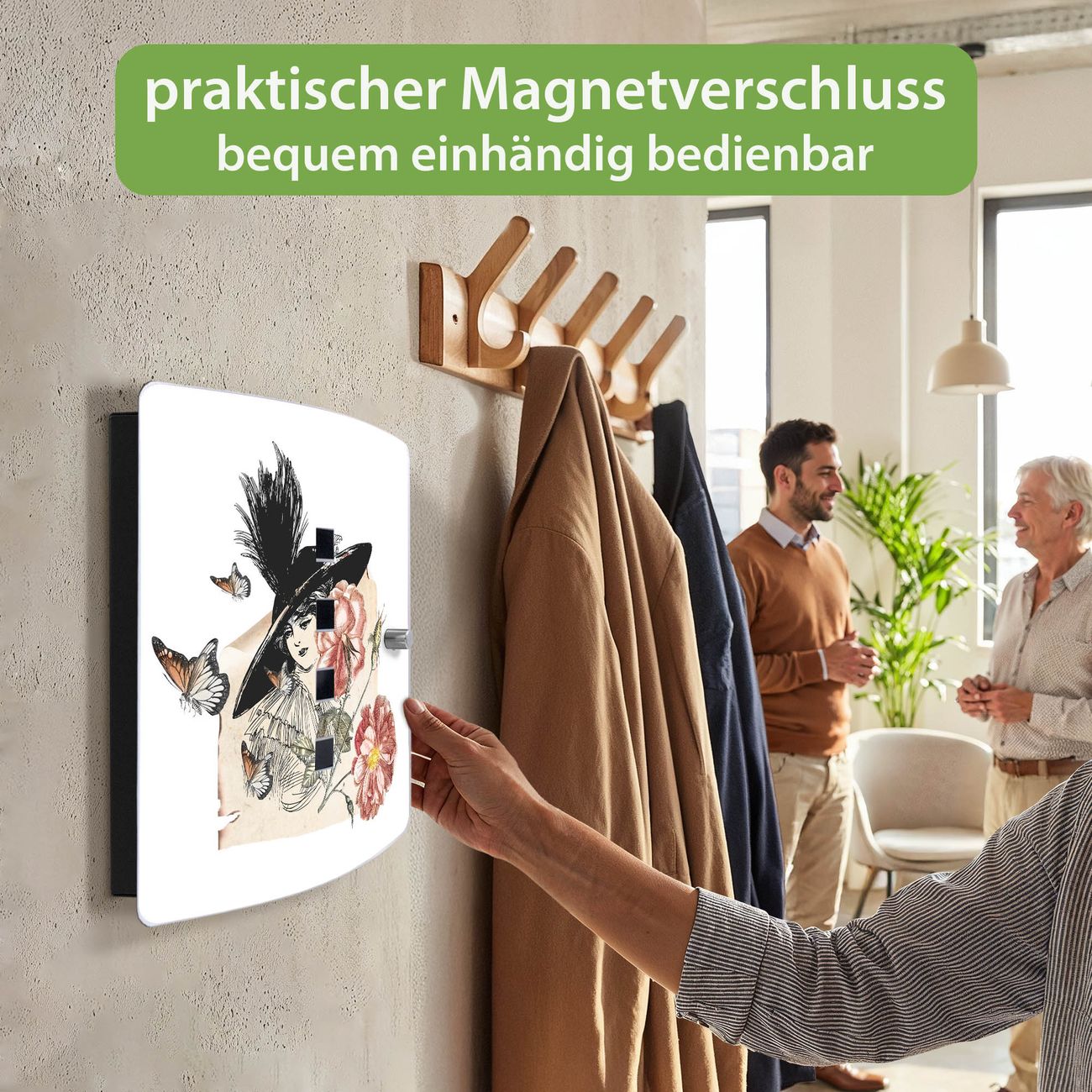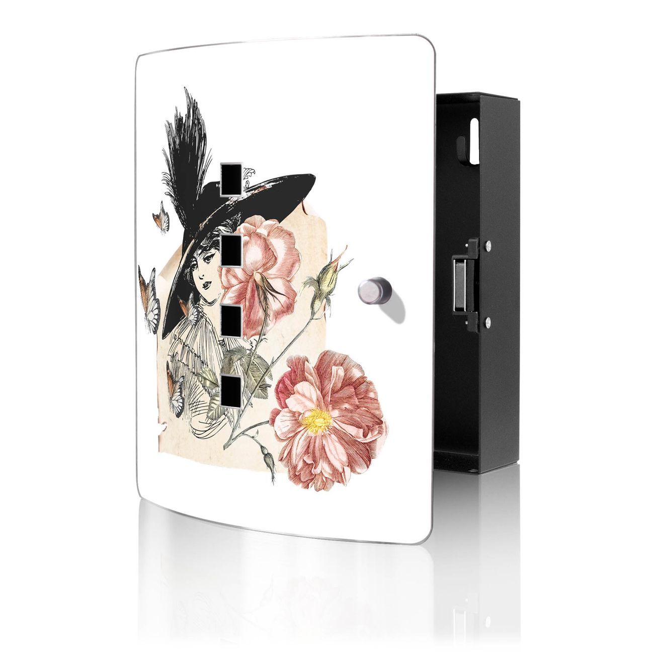 Funktion / Nutzen: Die leicht geschwungene Edelstahltür ist mit einer hochwertigen Motivfolie und dem Motiv Motiv Frau und Blühten Vintage kaschiert. Ein praktischer Magnetverschluss ermöglicht Ihnen ein schnelles Öffnen und Schließen. Befestigt wird der Schlüsselkasten an 2 Stellen auf der Rückseite, passendes Montagematerial fügen wir bereits bei.