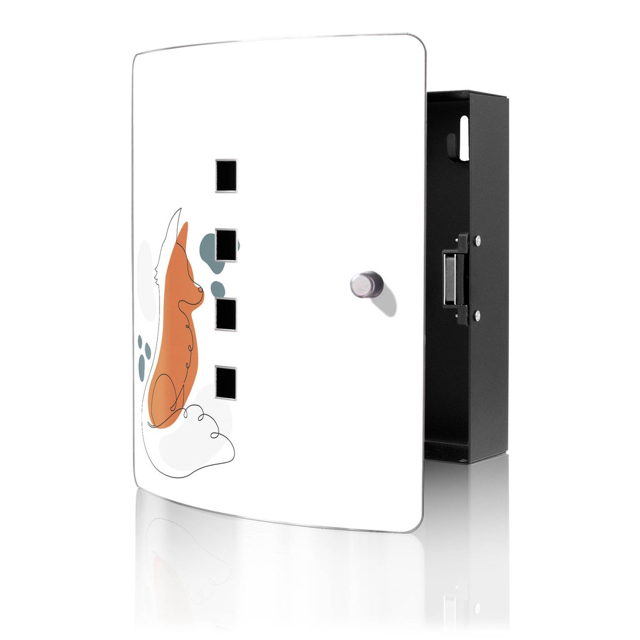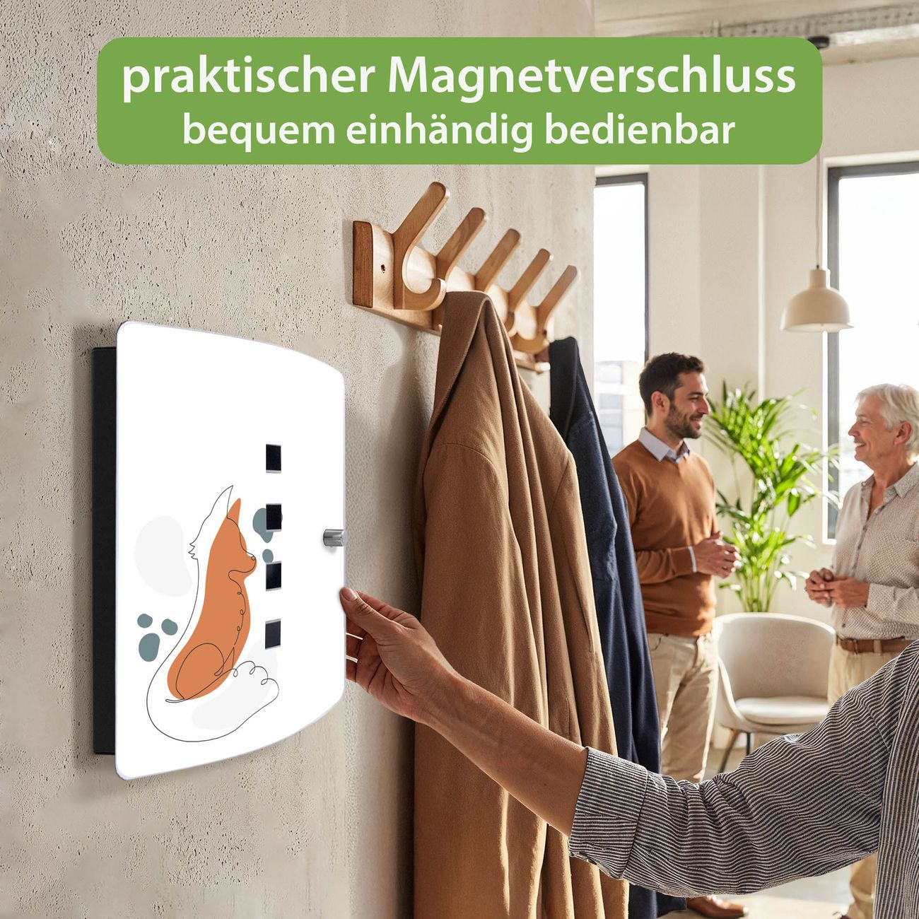 Funktion / Nutzen: Die leicht geschwungene Edelstahltür ist mit einer hochwertigen Motivfolie und dem Motiv Motiv Fuchs Lineart kaschiert. Ein praktischer Magnetverschluss ermöglicht Ihnen ein schnelles Öffnen und Schließen. Befestigt wird der Schlüsselkasten an 2 Stellen auf der Rückseite, passendes Montagematerial fügen wir bereits bei.