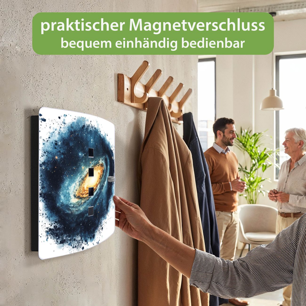 Funktion / Nutzen: Die leicht geschwungene Edelstahltür ist mit einer hochwertigen Motivfolie und dem Motiv Motiv Galaktische Explosion kaschiert. Ein praktischer Magnetverschluss ermöglicht Ihnen ein schnelles Öffnen und Schließen. Befestigt wird der Schlüsselkasten an 2 Stellen auf der Rückseite, passendes Montagematerial fügen wir bereits bei.