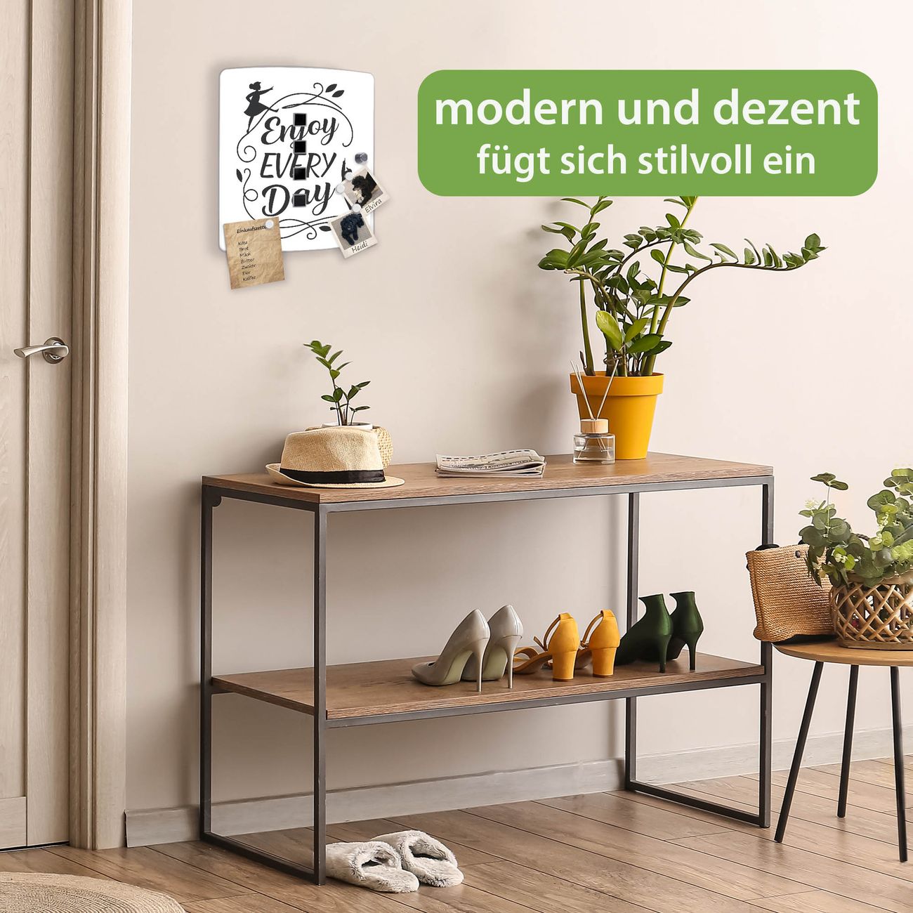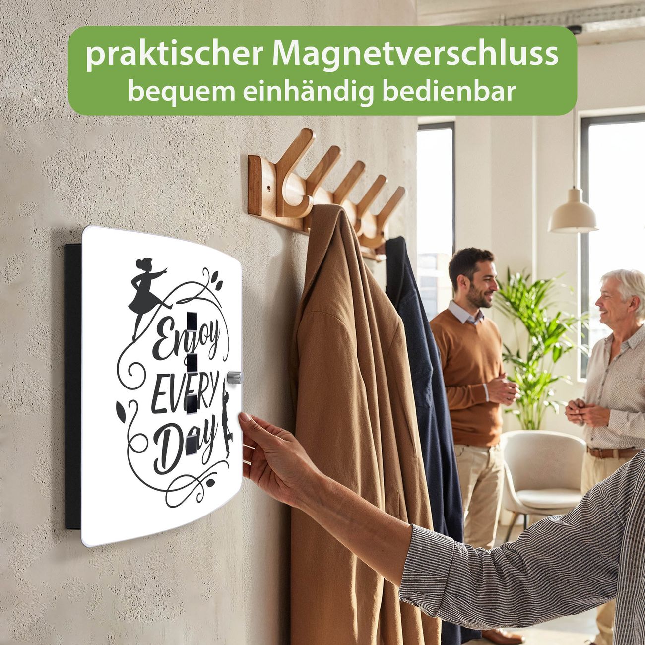 Funktion / Nutzen: Die leicht geschwungene Edelstahltür ist mit einer hochwertigen Motivfolie und dem Motiv Motiv Genieße Jeden Tag kaschiert. Ein praktischer Magnetverschluss ermöglicht Ihnen ein schnelles Öffnen und Schließen. Befestigt wird der Schlüsselkasten an 2 Stellen auf der Rückseite, passendes Montagematerial fügen wir bereits bei.