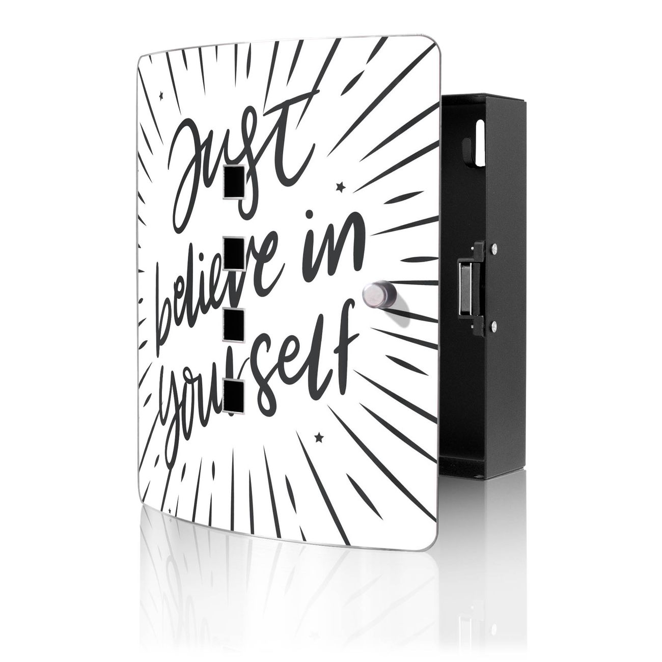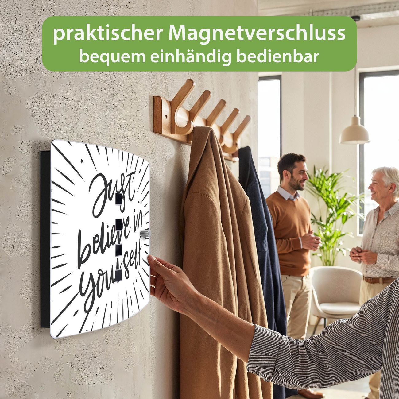 Funktion / Nutzen: Die leicht geschwungene Edelstahltür ist mit einer hochwertigen Motivfolie und dem Motiv Motiv Glaube an dich kaschiert. Ein praktischer Magnetverschluss ermöglicht Ihnen ein schnelles Öffnen und Schließen. Befestigt wird der Schlüsselkasten an 2 Stellen auf der Rückseite, passendes Montagematerial fügen wir bereits bei.