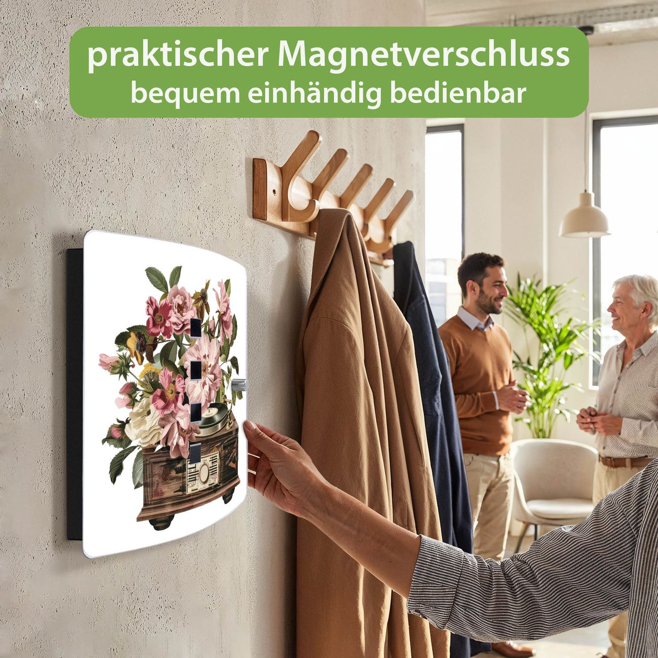 Funktion / Nutzen: Die leicht geschwungene Edelstahltür ist mit einer hochwertigen Motivfolie und dem Motiv Motiv Grammophon Vintage kaschiert. Ein praktischer Magnetverschluss ermöglicht Ihnen ein schnelles Öffnen und Schließen. Befestigt wird der Schlüsselkasten an 2 Stellen auf der Rückseite, passendes Montagematerial fügen wir bereits bei.