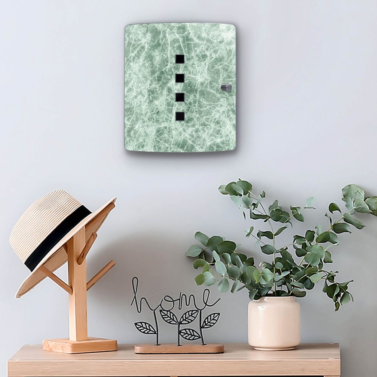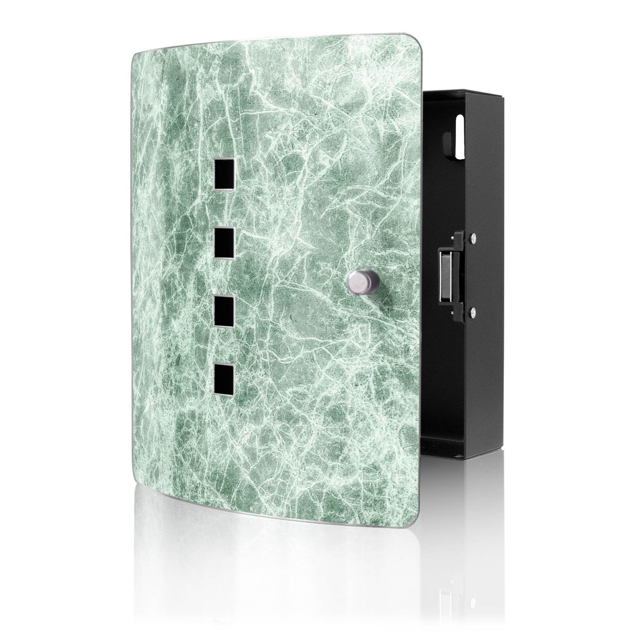 Funktion / Nutzen: Die leicht geschwungene Edelstahltür ist mit einer hochwertigen Motivfolie und dem Motiv Motiv Grüner Marmor 1 kaschiert. Ein praktischer Magnetverschluss ermöglicht Ihnen ein schnelles Öffnen und Schließen. Befestigt wird der Schlüsselkasten an 2 Stellen auf der Rückseite, passendes Montagematerial fügen wir bereits bei.