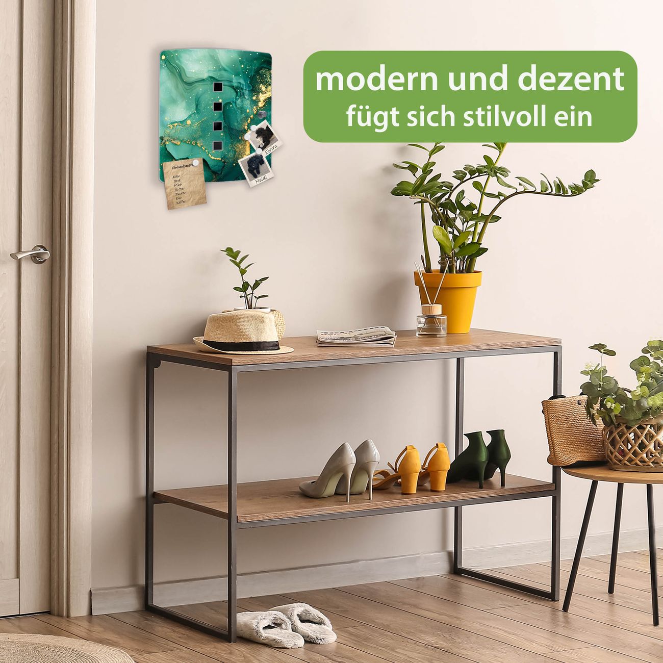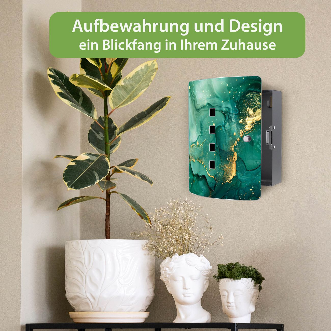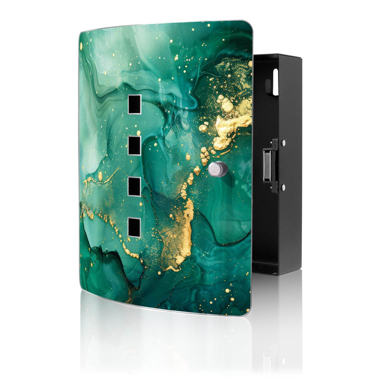 Funktion / Nutzen: Die leicht geschwungene Edelstahltür ist mit einer hochwertigen Motivfolie und dem Motiv Motiv Grüner Marmor mit Gold 1 kaschiert. Ein praktischer Magnetverschluss ermöglicht Ihnen ein schnelles Öffnen und Schließen. Befestigt wird der Schlüsselkasten an 2 Stellen auf der Rückseite, passendes Montagematerial fügen wir bereits bei.