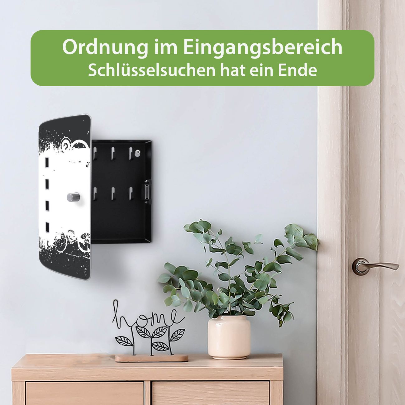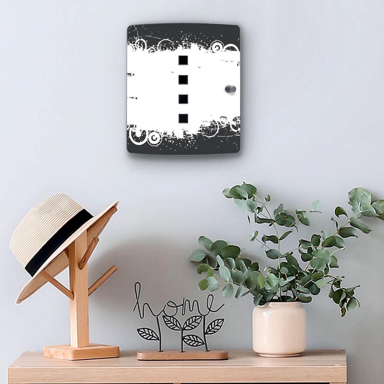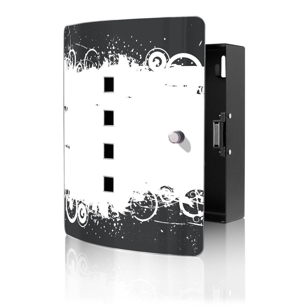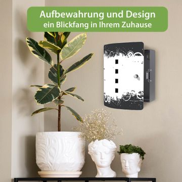 Funktion / Nutzen: Die leicht geschwungene Edelstahltür ist mit einer hochwertigen Motivfolie und dem Motiv Motiv Grunge Swirl Hintergrund kaschiert. Ein praktischer Magnetverschluss ermöglicht Ihnen ein schnelles Öffnen und Schließen. Befestigt wird der Schlüsselkasten an 2 Stellen auf der Rückseite, passendes Montagematerial fügen wir bereits bei.