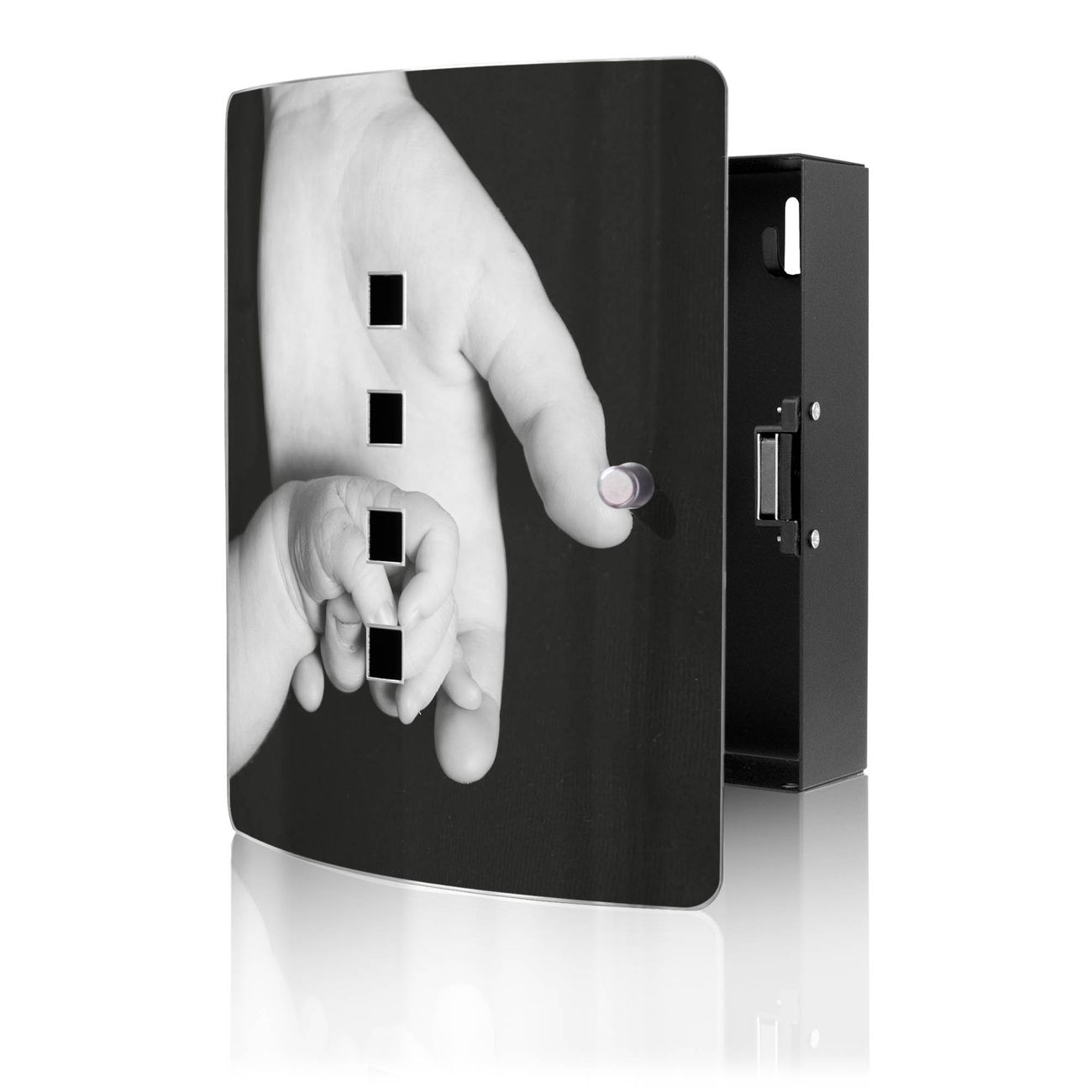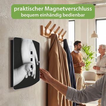 Funktion / Nutzen: Die leicht geschwungene Edelstahltür ist mit einer hochwertigen Motivfolie und dem Motiv Motiv Hands kaschiert. Ein praktischer Magnetverschluss ermöglicht Ihnen ein schnelles Öffnen und Schließen. Befestigt wird der Schlüsselkasten an 2 Stellen auf der Rückseite, passendes Montagematerial fügen wir bereits bei.