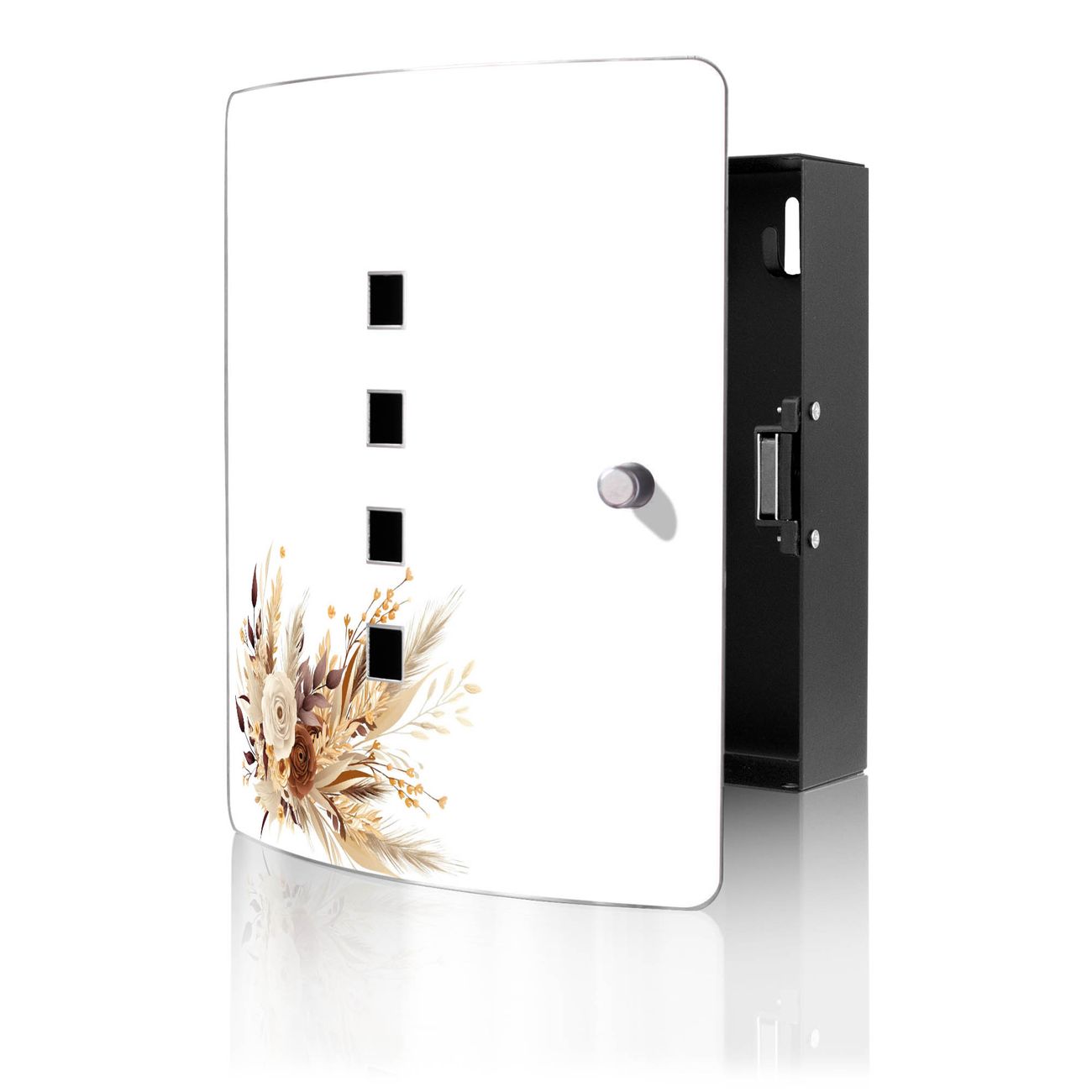 Funktion / Nutzen: Die leicht geschwungene Edelstahltür ist mit einer hochwertigen Motivfolie und dem Motiv Motiv Herbstlicher Blumenstrauß kaschiert. Ein praktischer Magnetverschluss ermöglicht Ihnen ein schnelles Öffnen und Schließen. Befestigt wird der Schlüsselkasten an 2 Stellen auf der Rückseite, passendes Montagematerial fügen wir bereits bei.