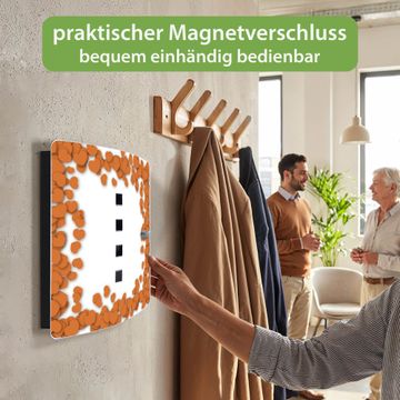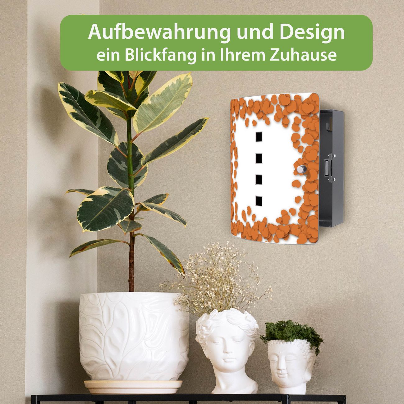 Funktion / Nutzen: Die leicht geschwungene Edelstahltür ist mit einer hochwertigen Motivfolie und dem Motiv Motiv Herzrahmen in Orange kaschiert. Ein praktischer Magnetverschluss ermöglicht Ihnen ein schnelles Öffnen und Schließen. Befestigt wird der Schlüsselkasten an 2 Stellen auf der Rückseite, passendes Montagematerial fügen wir bereits bei.