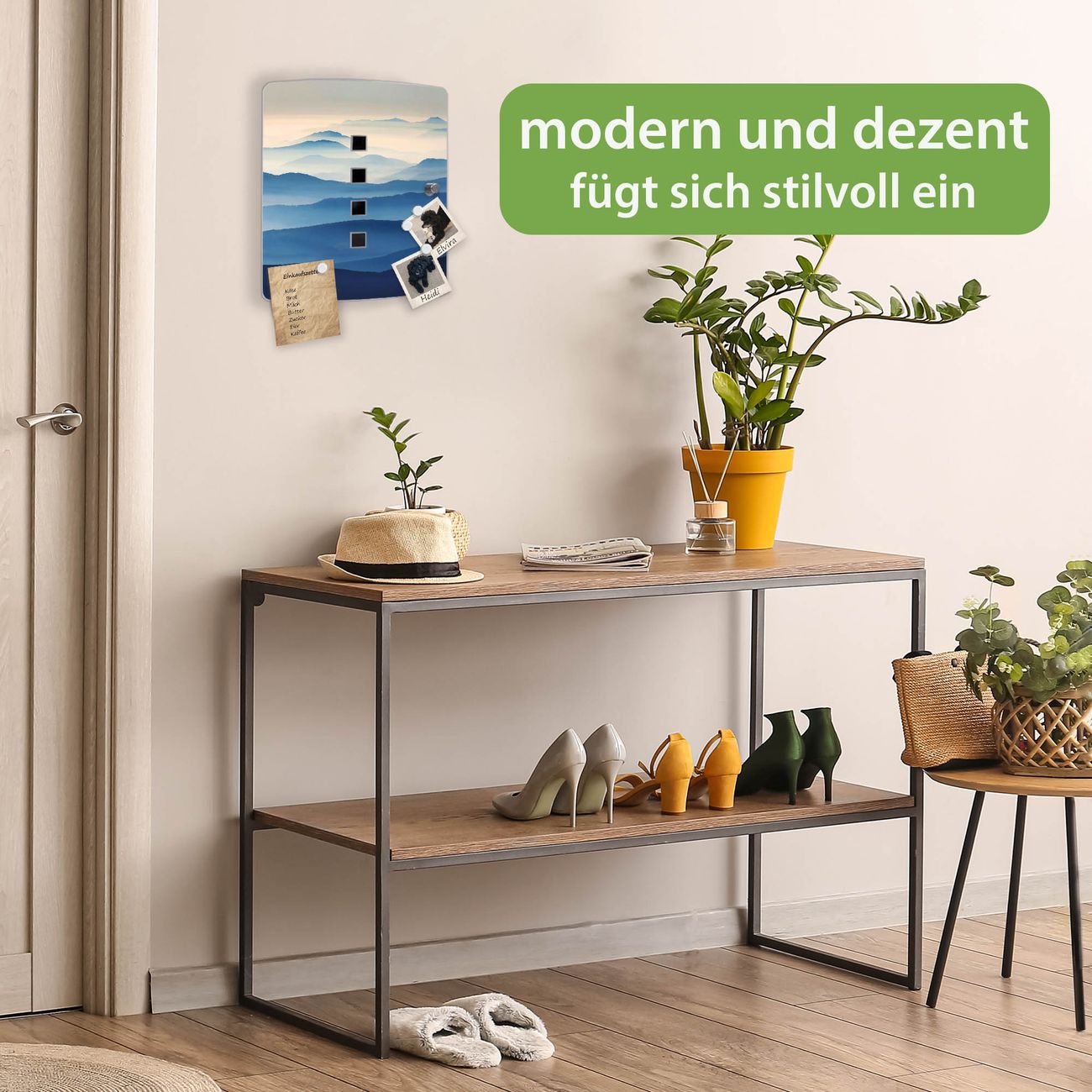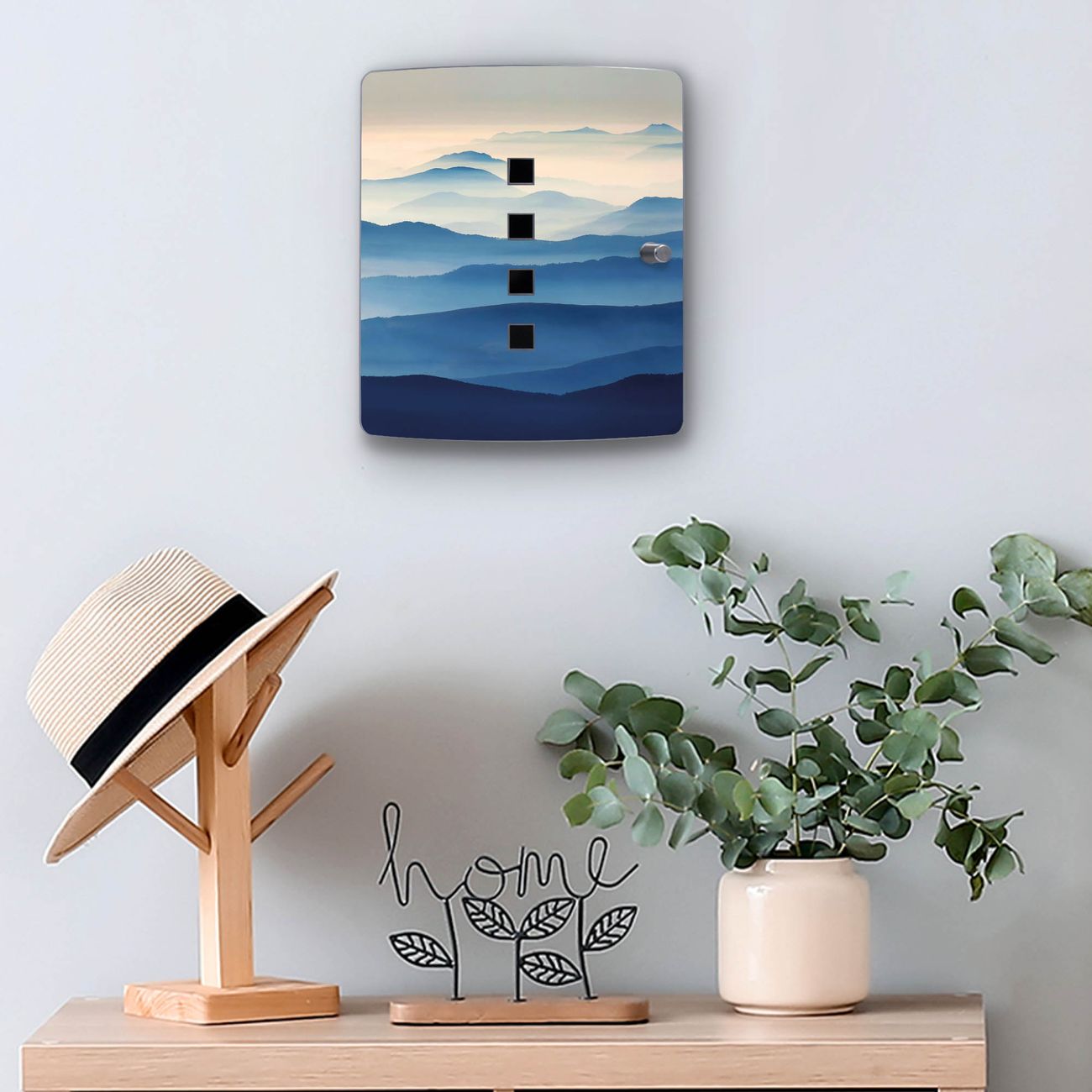 Funktion / Nutzen: Die leicht geschwungene Edelstahltür ist mit einer hochwertigen Motivfolie und dem Motiv Motiv Hinter den Bergen kaschiert. Ein praktischer Magnetverschluss ermöglicht Ihnen ein schnelles Öffnen und Schließen. Befestigt wird der Schlüsselkasten an 2 Stellen auf der Rückseite, passendes Montagematerial fügen wir bereits bei.