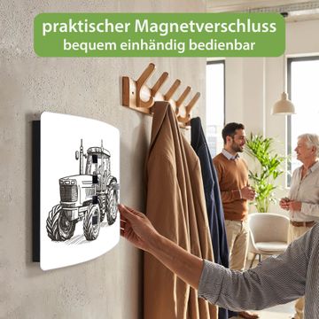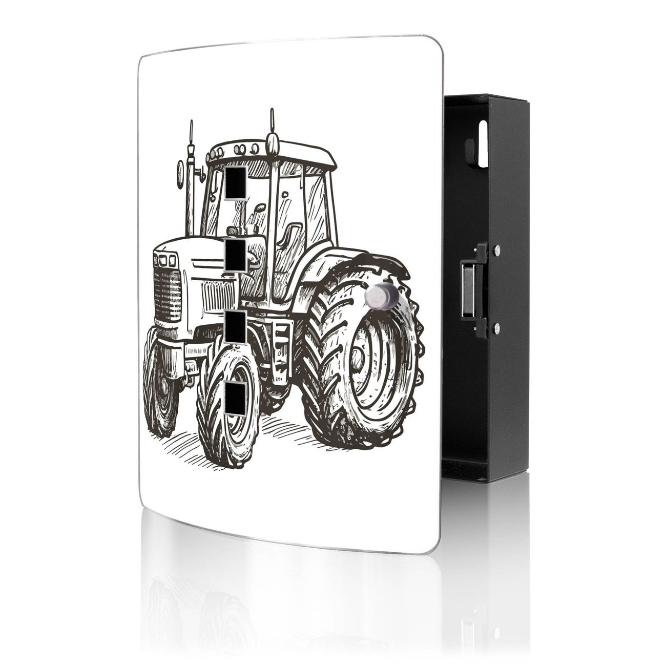 Funktion / Nutzen: Die leicht geschwungene Edelstahltür ist mit einer hochwertigen Motivfolie und dem Motiv Motiv Historischer Traktor kaschiert. Ein praktischer Magnetverschluss ermöglicht Ihnen ein schnelles Öffnen und Schließen. Befestigt wird der Schlüsselkasten an 2 Stellen auf der Rückseite, passendes Montagematerial fügen wir bereits bei.