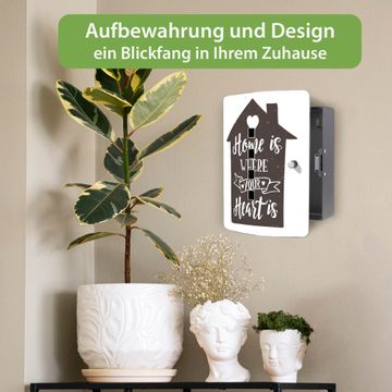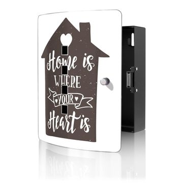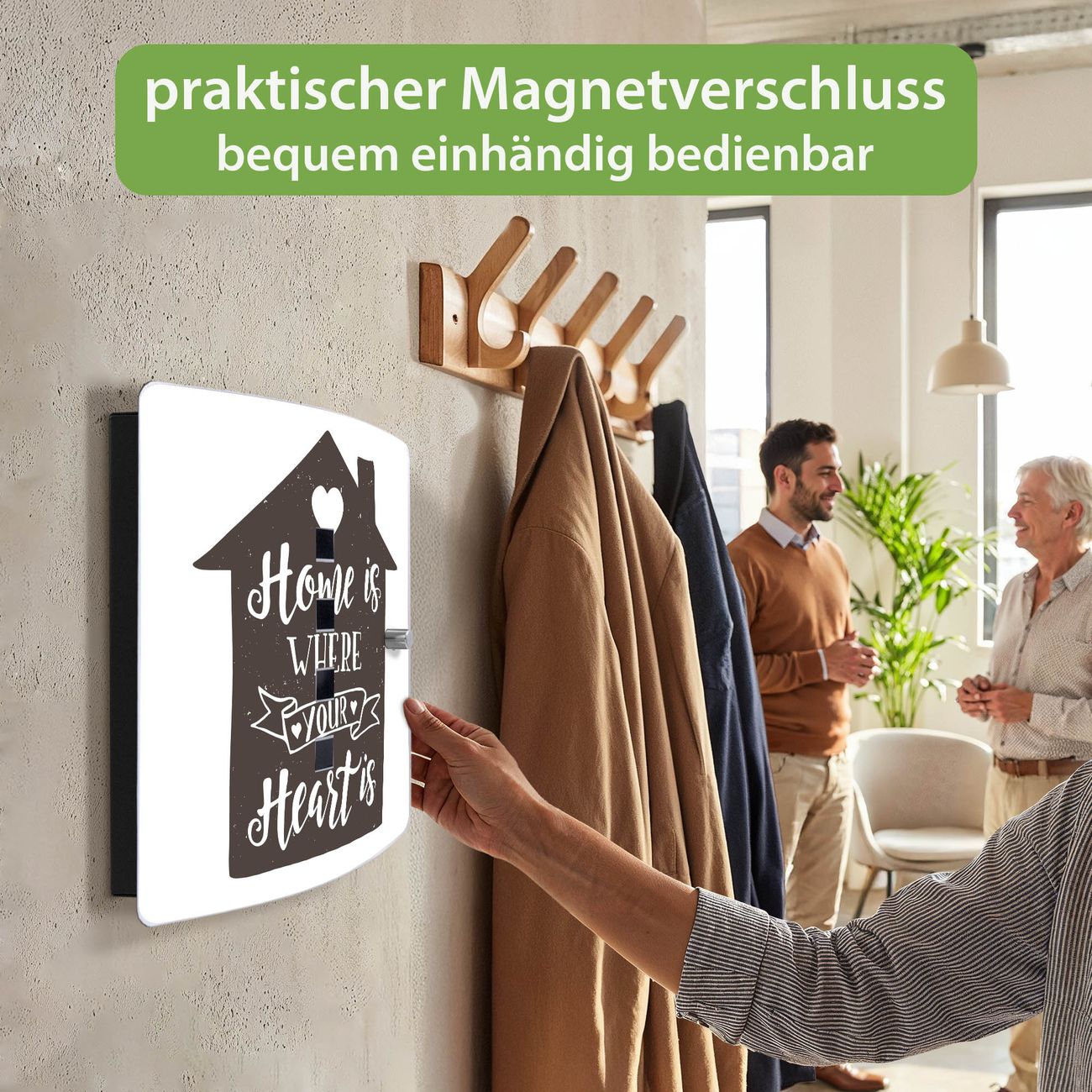 Funktion / Nutzen: Die leicht geschwungene Edelstahltür ist mit einer hochwertigen Motivfolie und dem Motiv Motiv Home is where your Heart is kaschiert. Ein praktischer Magnetverschluss ermöglicht Ihnen ein schnelles Öffnen und Schließen. Befestigt wird der Schlüsselkasten an 2 Stellen auf der Rückseite, passendes Montagematerial fügen wir bereits bei.