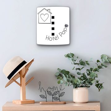 Funktion / Nutzen: Die leicht geschwungene Edelstahltür ist mit einer hochwertigen Motivfolie und dem Motiv Motiv Hotel Papa Haus mit Herz 2 kaschiert. Ein praktischer Magnetverschluss ermöglicht Ihnen ein schnelles Öffnen und Schließen. Befestigt wird der Schlüsselkasten an 2 Stellen auf der Rückseite, passendes Montagematerial fügen wir bereits bei.
