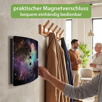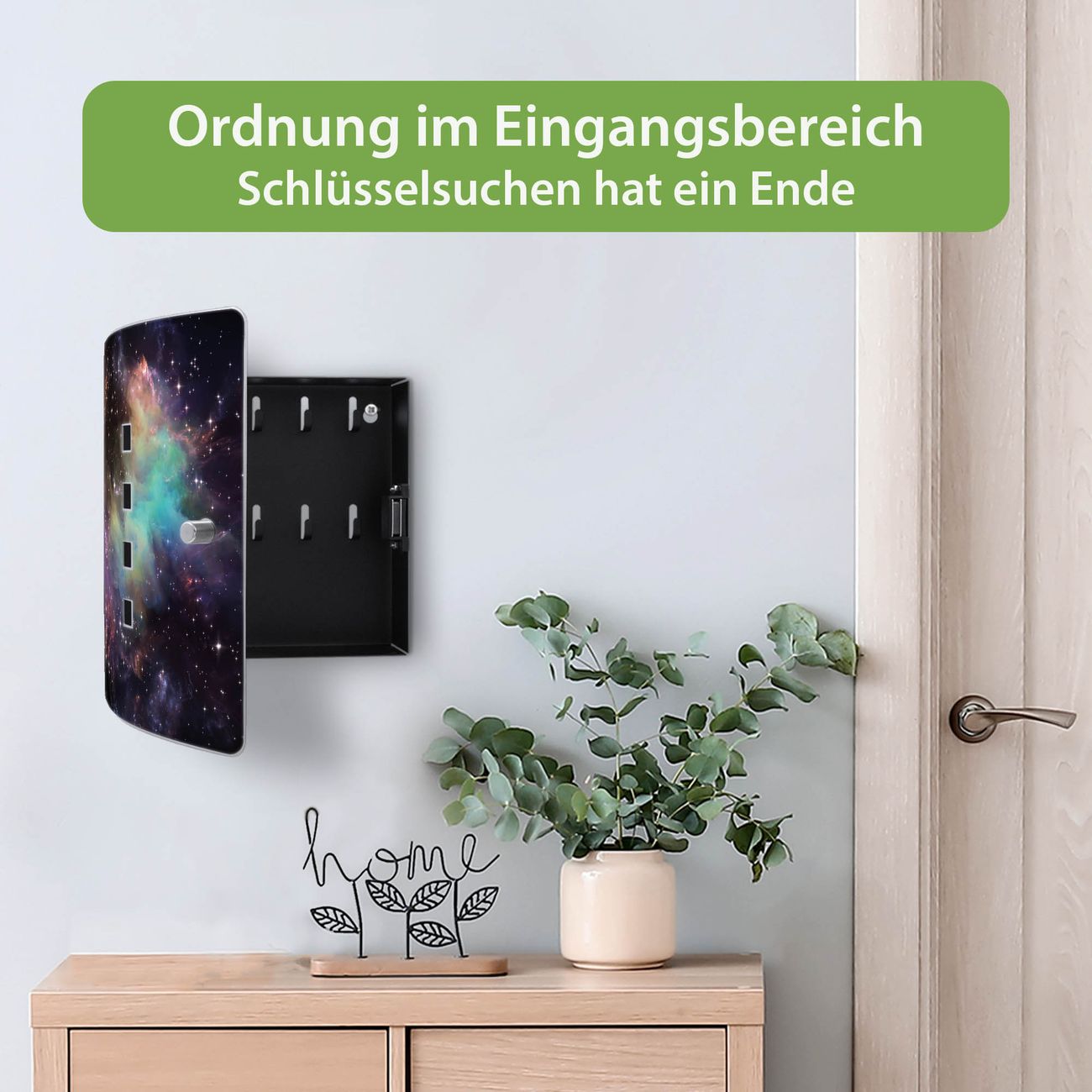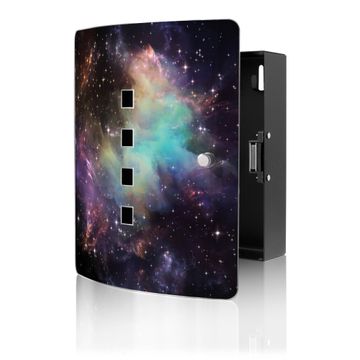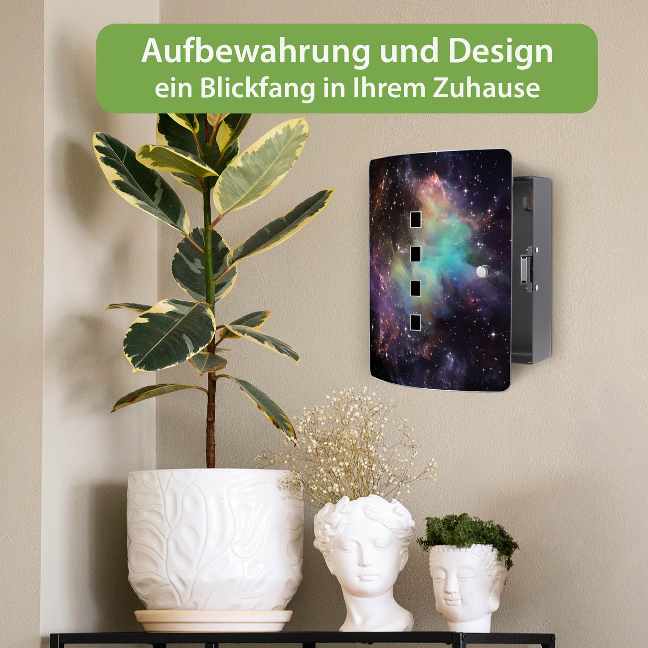 Funktion / Nutzen: Die leicht geschwungene Edelstahltür ist mit einer hochwertigen Motivfolie und dem Motiv Motiv Im Weltall 2 kaschiert. Ein praktischer Magnetverschluss ermöglicht Ihnen ein schnelles Öffnen und Schließen. Befestigt wird der Schlüsselkasten an 2 Stellen auf der Rückseite, passendes Montagematerial fügen wir bereits bei.