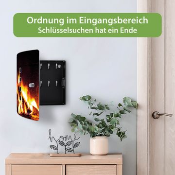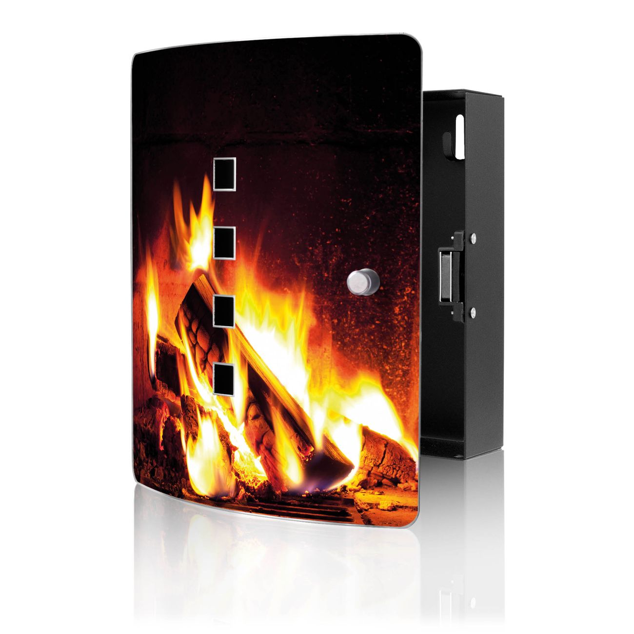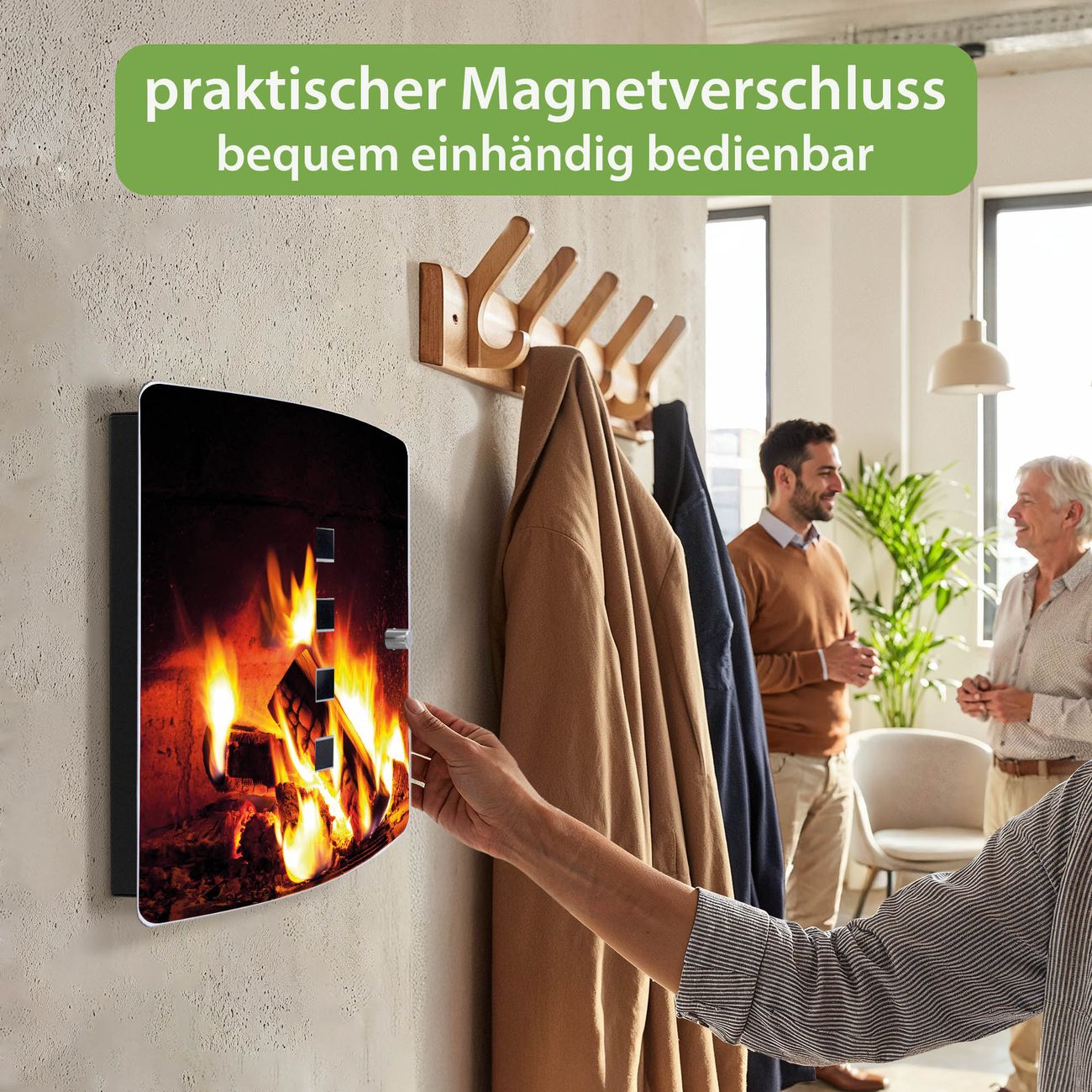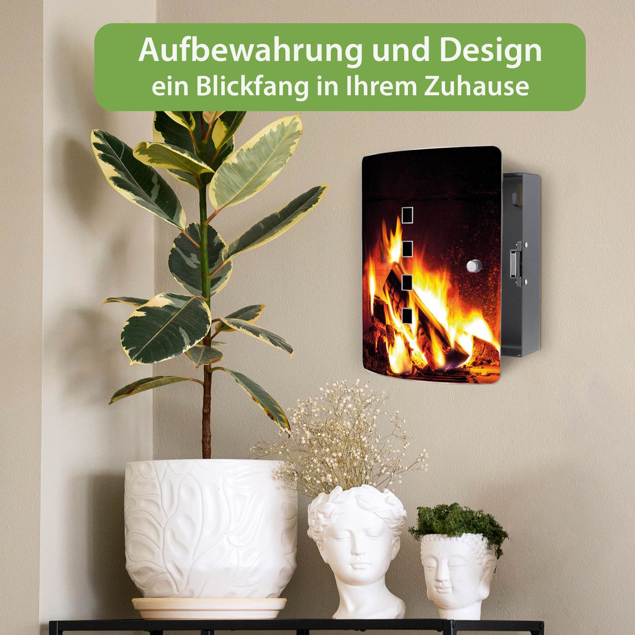 Funktion / Nutzen: Die leicht geschwungene Edelstahltür ist mit einer hochwertigen Motivfolie und dem Motiv Motiv Kaminfeuer kaschiert. Ein praktischer Magnetverschluss ermöglicht Ihnen ein schnelles Öffnen und Schließen. Befestigt wird der Schlüsselkasten an 2 Stellen auf der Rückseite, passendes Montagematerial fügen wir bereits bei.