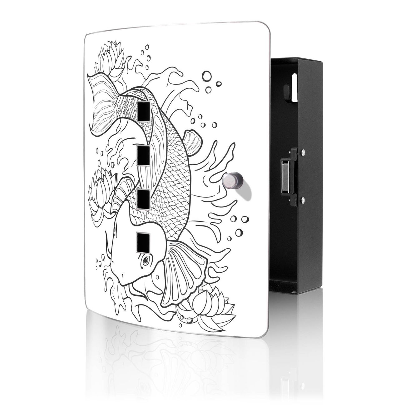 Funktion / Nutzen: Die leicht geschwungene Edelstahltür ist mit einer hochwertigen Motivfolie und dem Motiv Motiv Koi 2 kaschiert. Ein praktischer Magnetverschluss ermöglicht Ihnen ein schnelles Öffnen und Schließen. Befestigt wird der Schlüsselkasten an 2 Stellen auf der Rückseite, passendes Montagematerial fügen wir bereits bei.