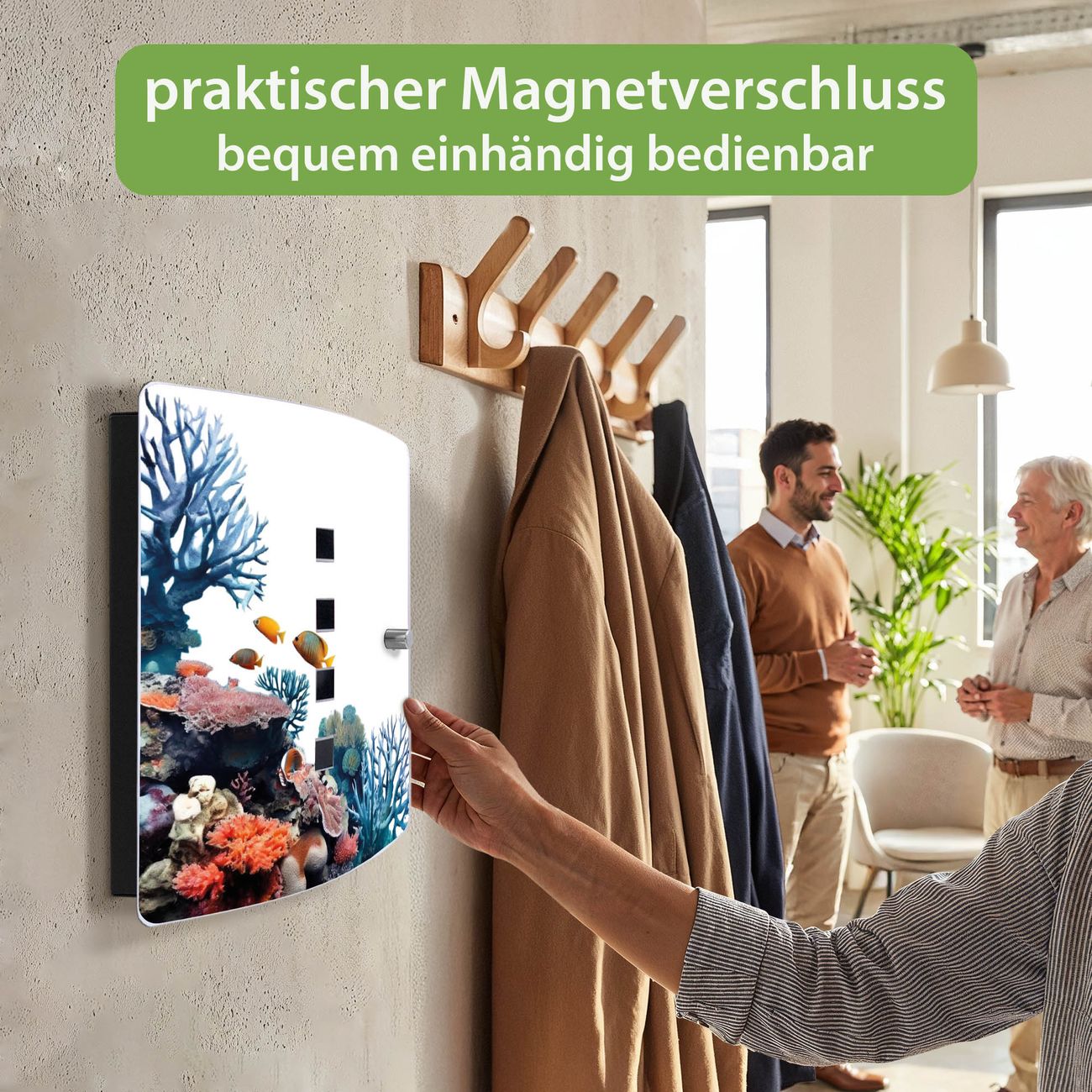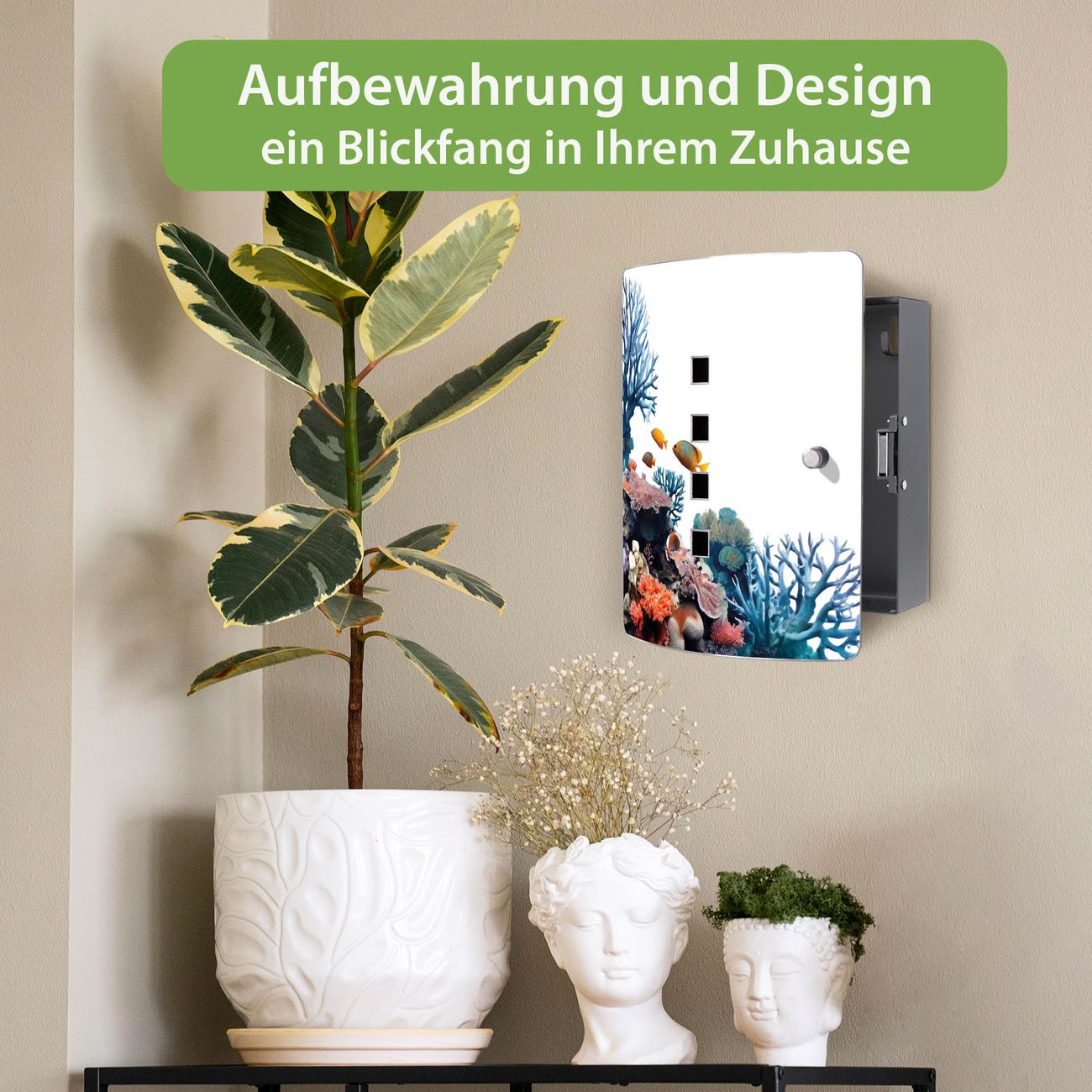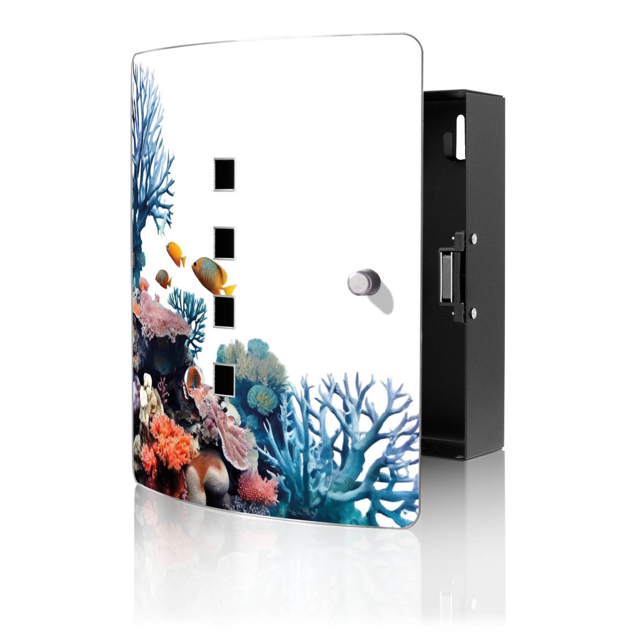 Funktion / Nutzen: Die leicht geschwungene Edelstahltür ist mit einer hochwertigen Motivfolie und dem Motiv Motiv Korallenriff und Fische kaschiert. Ein praktischer Magnetverschluss ermöglicht Ihnen ein schnelles Öffnen und Schließen. Befestigt wird der Schlüsselkasten an 2 Stellen auf der Rückseite, passendes Montagematerial fügen wir bereits bei.