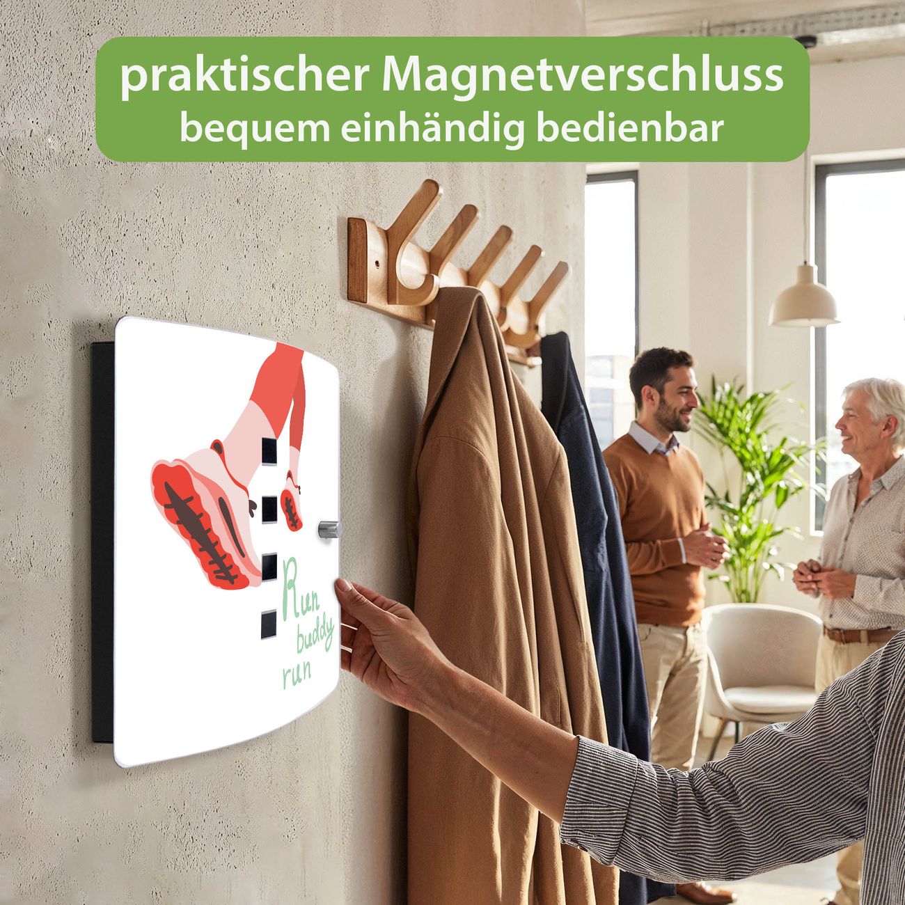 Funktion / Nutzen: Die leicht geschwungene Edelstahltür ist mit einer hochwertigen Motivfolie und dem Motiv Motiv Laufschuh Bewegung kaschiert. Ein praktischer Magnetverschluss ermöglicht Ihnen ein schnelles Öffnen und Schließen. Befestigt wird der Schlüsselkasten an 2 Stellen auf der Rückseite, passendes Montagematerial fügen wir bereits bei.