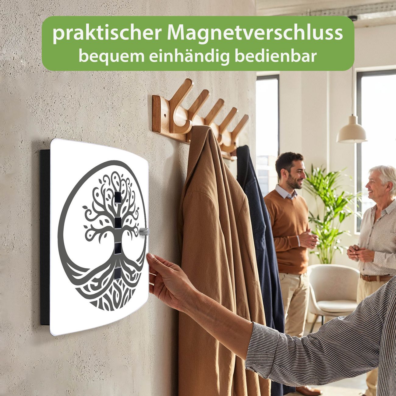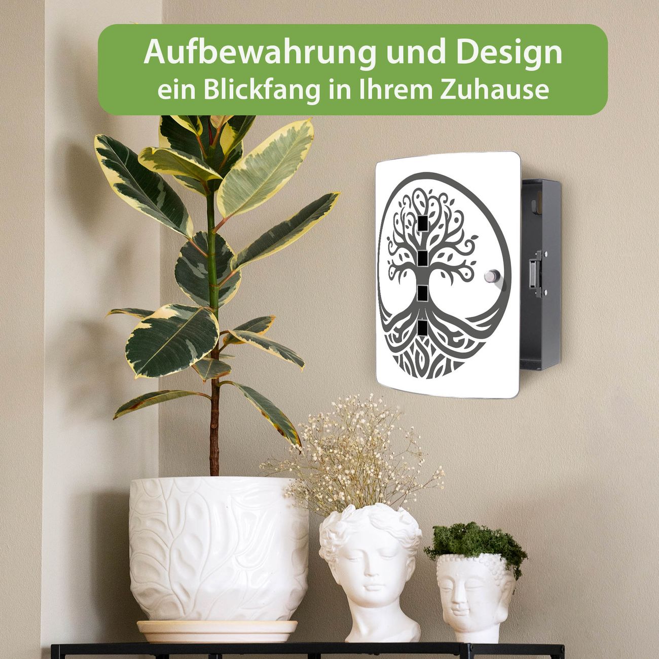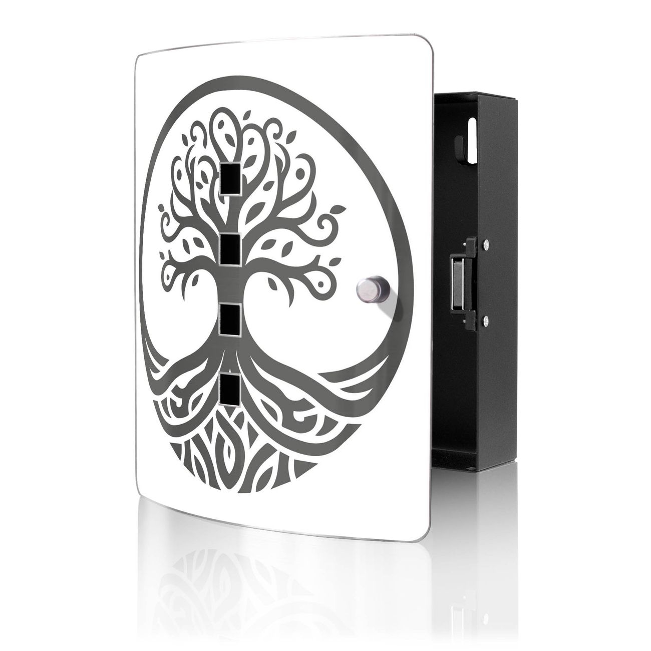 Funktion / Nutzen: Die leicht geschwungene Edelstahltür ist mit einer hochwertigen Motivfolie und dem Motiv Motiv Lebensbaum Silhouette 2 kaschiert. Ein praktischer Magnetverschluss ermöglicht Ihnen ein schnelles Öffnen und Schließen. Befestigt wird der Schlüsselkasten an 2 Stellen auf der Rückseite, passendes Montagematerial fügen wir bereits bei.