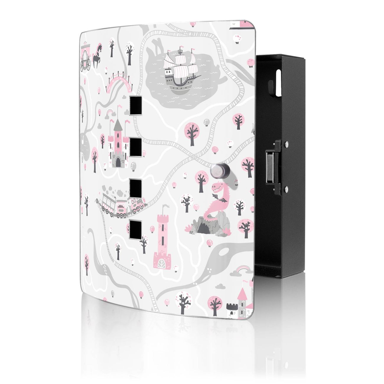Funktion / Nutzen: Die leicht geschwungene Edelstahltür ist mit einer hochwertigen Motivfolie und dem Motiv Motiv Märchendorf 1 kaschiert. Ein praktischer Magnetverschluss ermöglicht Ihnen ein schnelles Öffnen und Schließen. Befestigt wird der Schlüsselkasten an 2 Stellen auf der Rückseite, passendes Montagematerial fügen wir bereits bei.