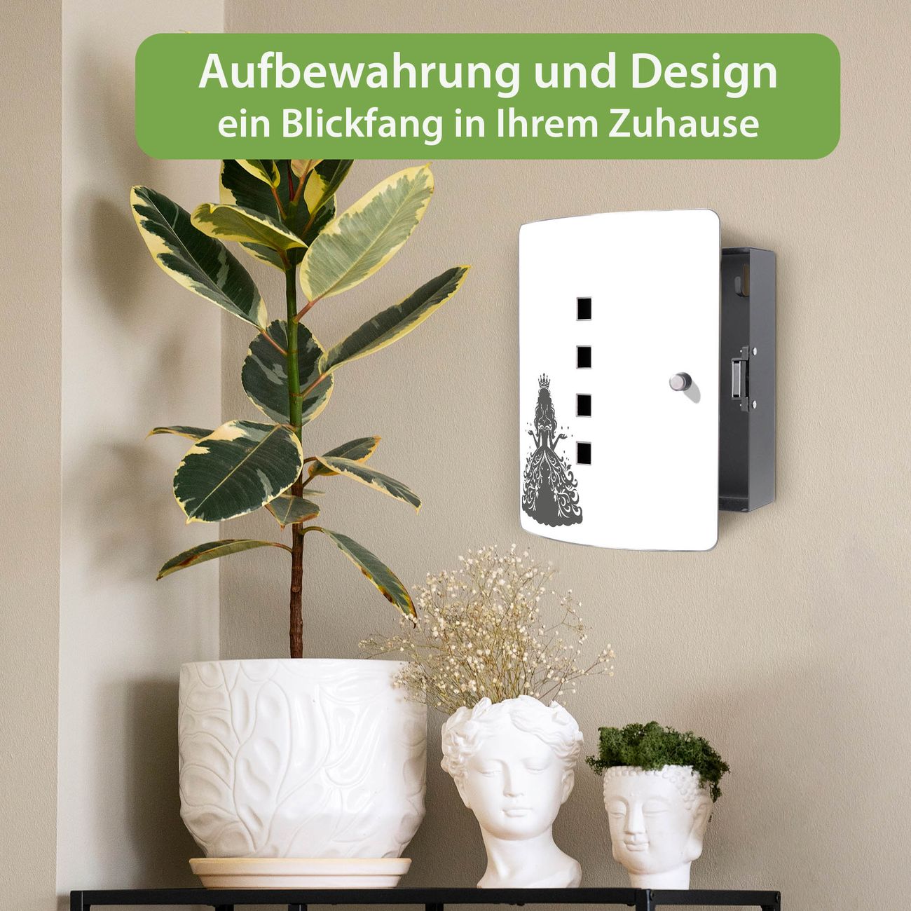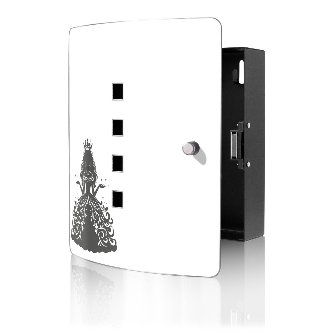 Funktion / Nutzen: Die leicht geschwungene Edelstahltür ist mit einer hochwertigen Motivfolie und dem Motiv Motiv Märchenprinzessin kaschiert. Ein praktischer Magnetverschluss ermöglicht Ihnen ein schnelles Öffnen und Schließen. Befestigt wird der Schlüsselkasten an 2 Stellen auf der Rückseite, passendes Montagematerial fügen wir bereits bei.