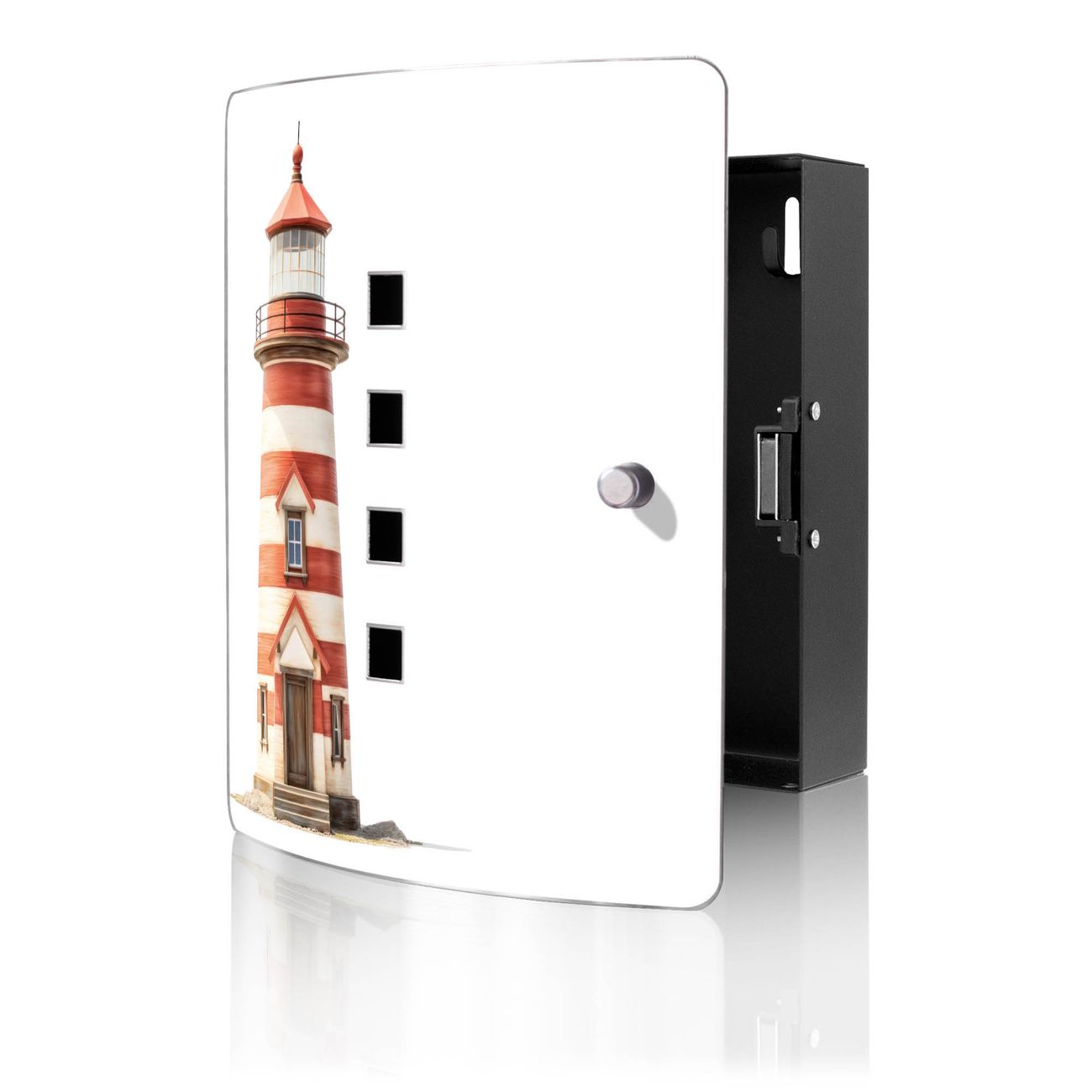 Funktion / Nutzen: Die leicht geschwungene Edelstahltür ist mit einer hochwertigen Motivfolie und dem Motiv Motiv Maritimer Leuchtturm kaschiert. Ein praktischer Magnetverschluss ermöglicht Ihnen ein schnelles Öffnen und Schließen. Befestigt wird der Schlüsselkasten an 2 Stellen auf der Rückseite, passendes Montagematerial fügen wir bereits bei.
