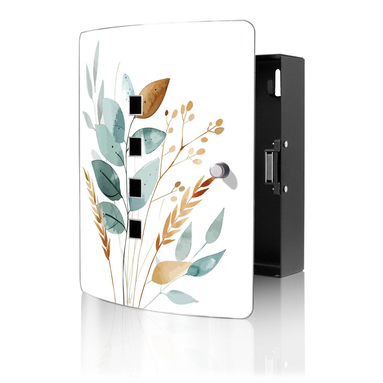 Funktion / Nutzen: Die leicht geschwungene Edelstahltür ist mit einer hochwertigen Motivfolie und dem Motiv Motiv Minimalistische Blätter kaschiert. Ein praktischer Magnetverschluss ermöglicht Ihnen ein schnelles Öffnen und Schließen. Befestigt wird der Schlüsselkasten an 2 Stellen auf der Rückseite, passendes Montagematerial fügen wir bereits bei.