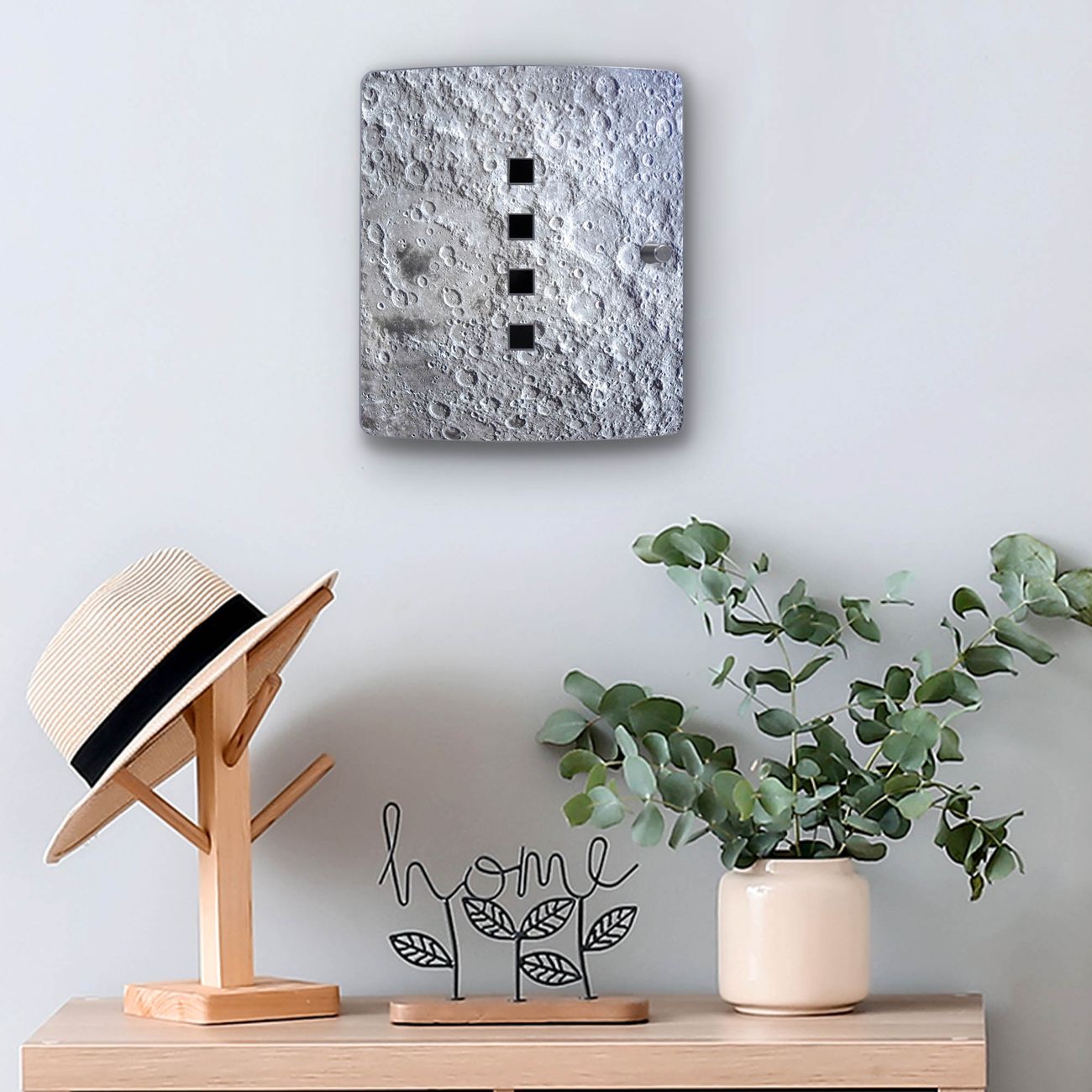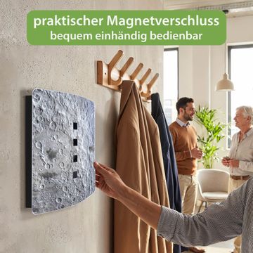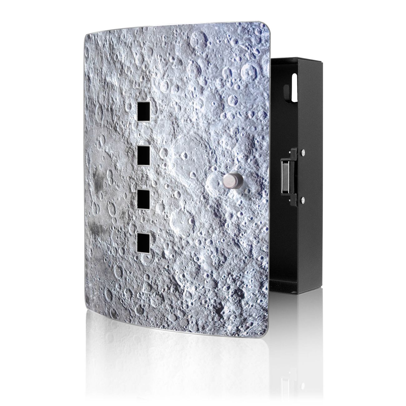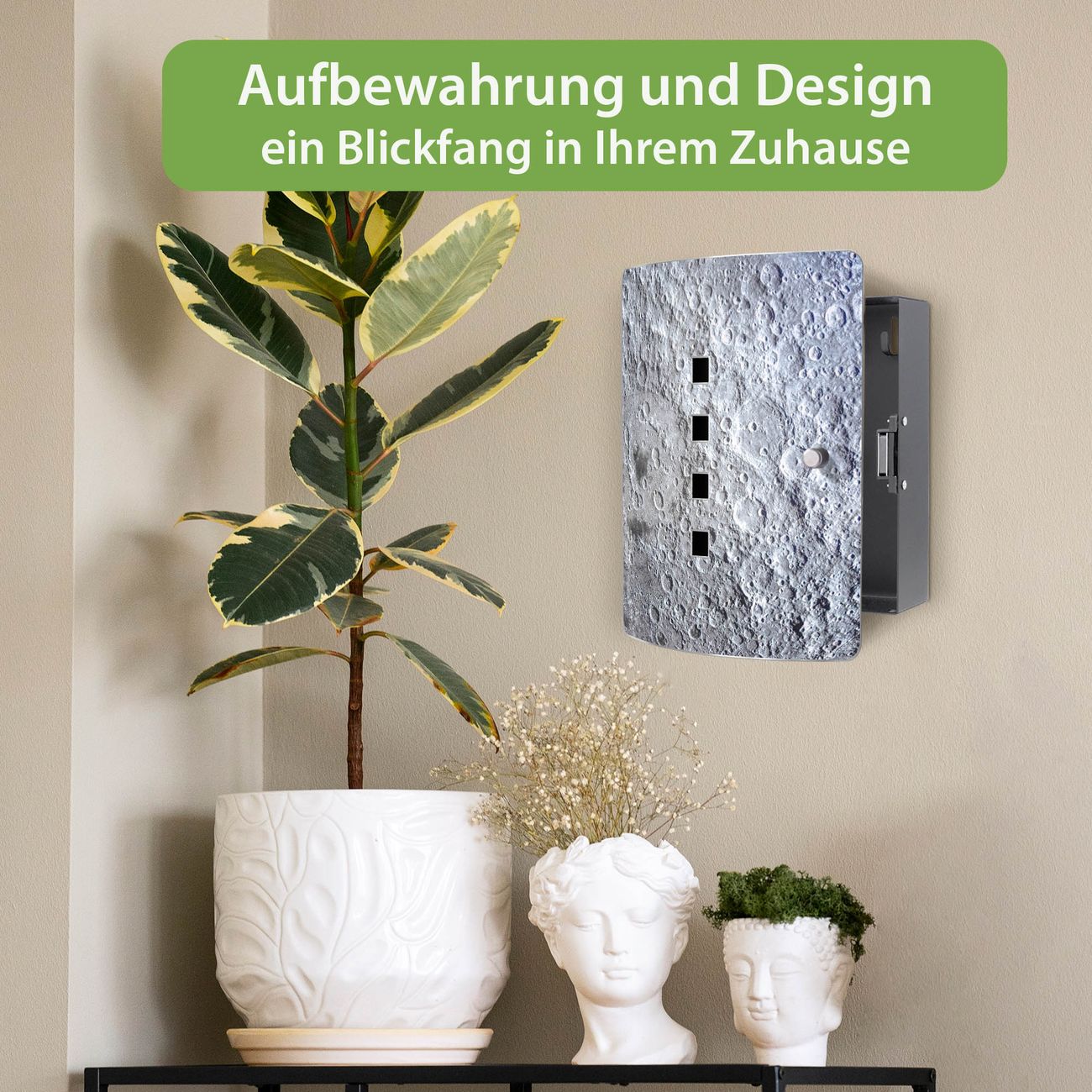 Funktion / Nutzen: Die leicht geschwungene Edelstahltür ist mit einer hochwertigen Motivfolie und dem Motiv Motiv Mondoberfläche kaschiert. Ein praktischer Magnetverschluss ermöglicht Ihnen ein schnelles Öffnen und Schließen. Befestigt wird der Schlüsselkasten an 2 Stellen auf der Rückseite, passendes Montagematerial fügen wir bereits bei.