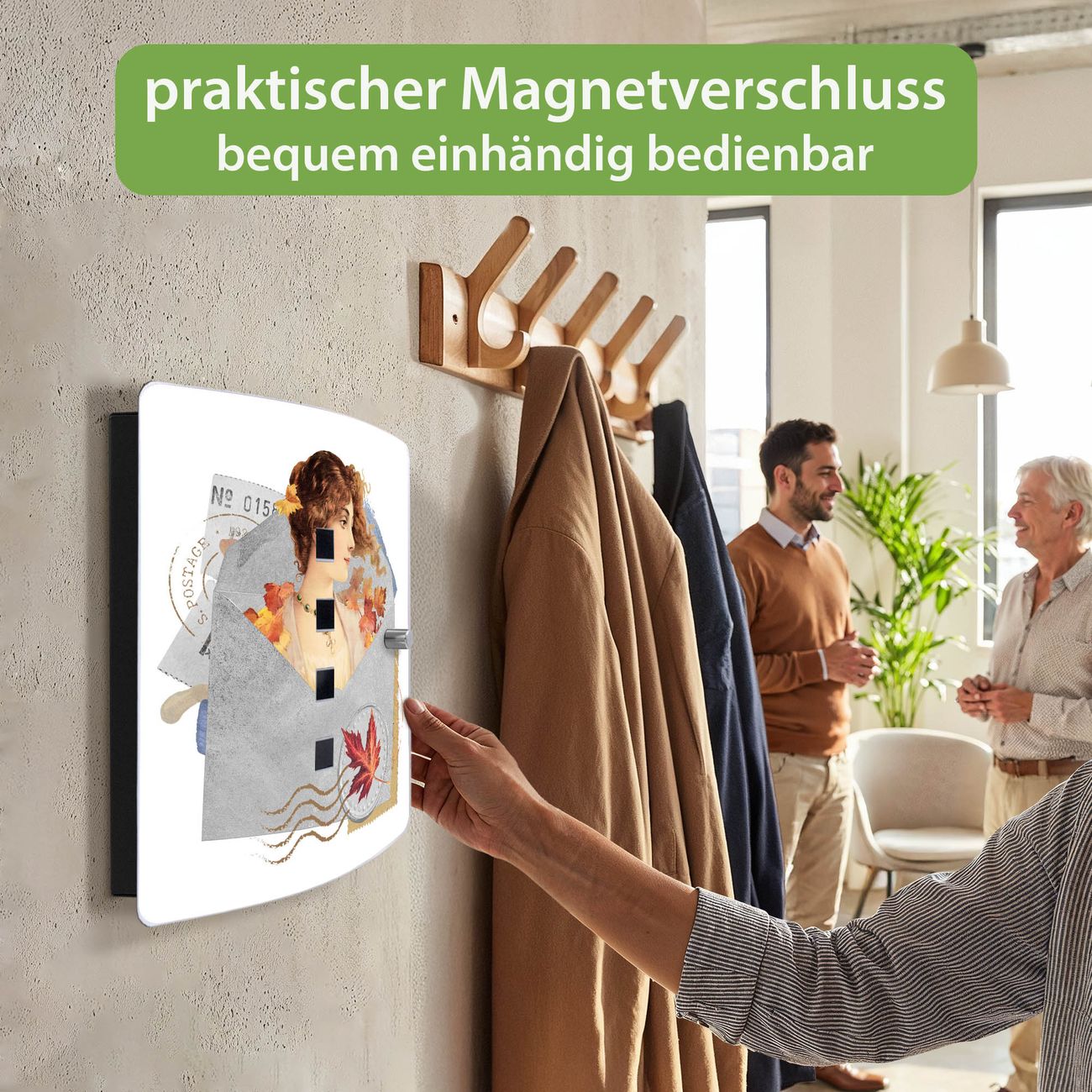 Funktion / Nutzen: Die leicht geschwungene Edelstahltür ist mit einer hochwertigen Motivfolie und dem Motiv Motiv Nostalgische Herbstgrüße Vintage kaschiert. Ein praktischer Magnetverschluss ermöglicht Ihnen ein schnelles Öffnen und Schließen. Befestigt wird der Schlüsselkasten an 2 Stellen auf der Rückseite, passendes Montagematerial fügen wir bereits bei.