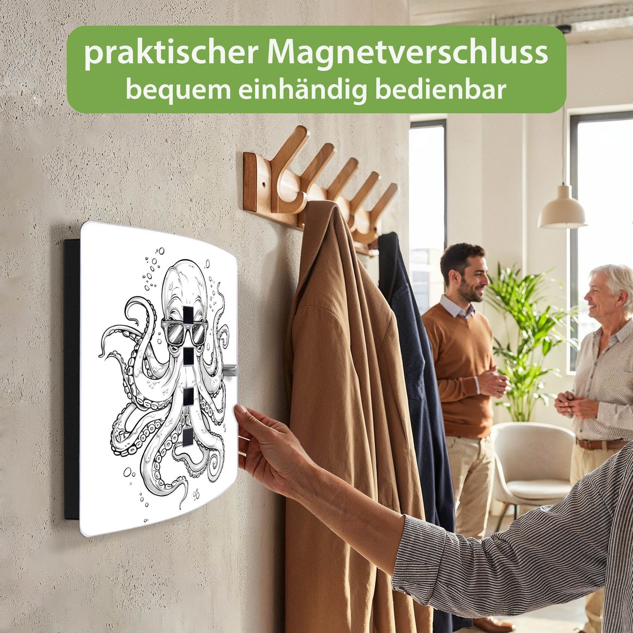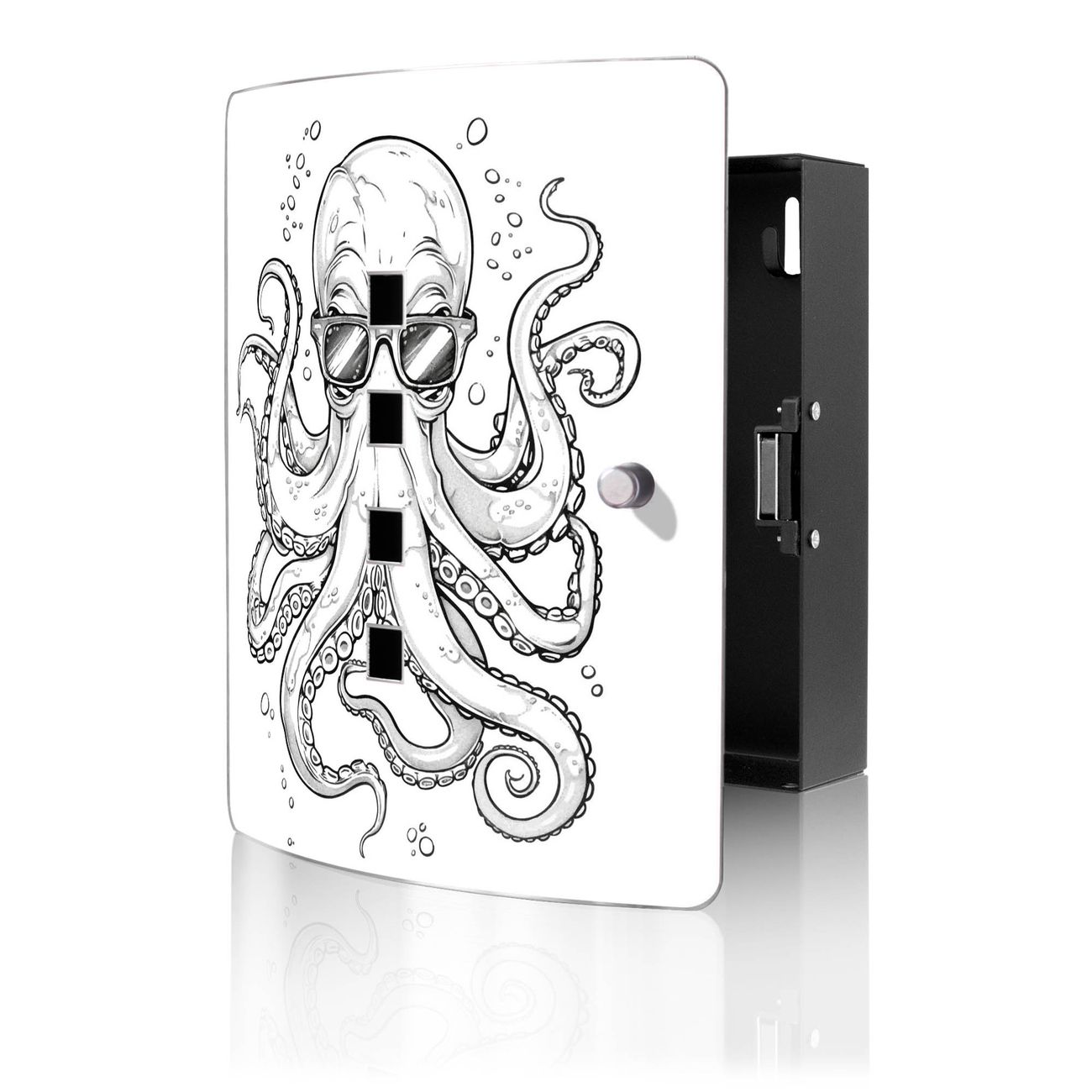 Funktion / Nutzen: Die leicht geschwungene Edelstahltür ist mit einer hochwertigen Motivfolie und dem Motiv Motiv Oktopus mit Brille kaschiert. Ein praktischer Magnetverschluss ermöglicht Ihnen ein schnelles Öffnen und Schließen. Befestigt wird der Schlüsselkasten an 2 Stellen auf der Rückseite, passendes Montagematerial fügen wir bereits bei.