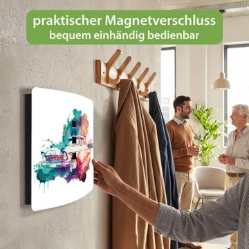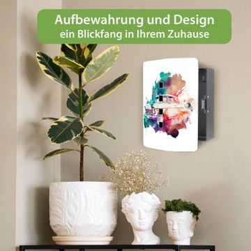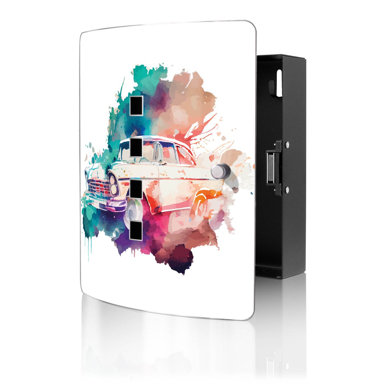 Funktion / Nutzen: Die leicht geschwungene Edelstahltür ist mit einer hochwertigen Motivfolie und dem Motiv Motiv Retro-Auto Aquarell kaschiert. Ein praktischer Magnetverschluss ermöglicht Ihnen ein schnelles Öffnen und Schließen. Befestigt wird der Schlüsselkasten an 2 Stellen auf der Rückseite, passendes Montagematerial fügen wir bereits bei.
