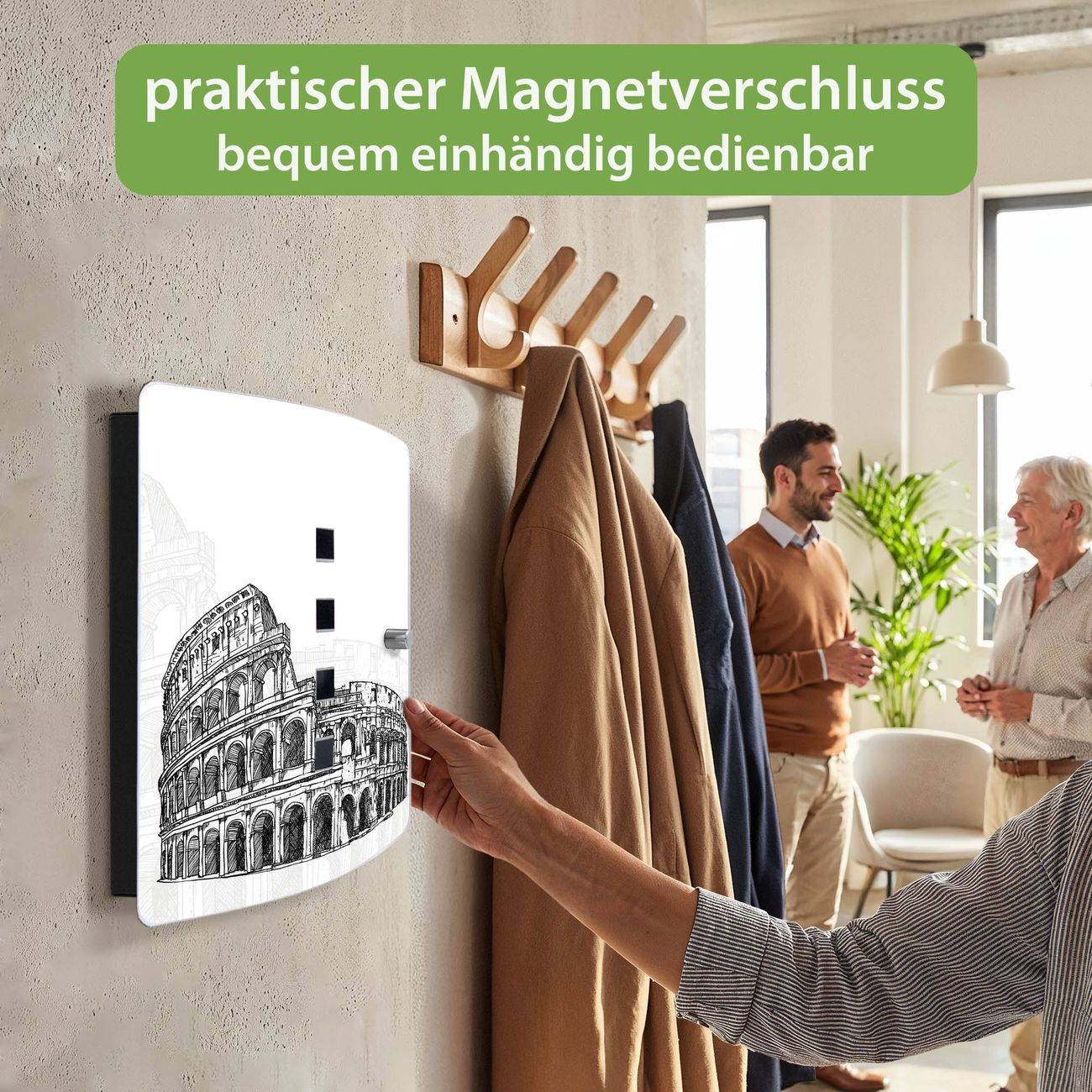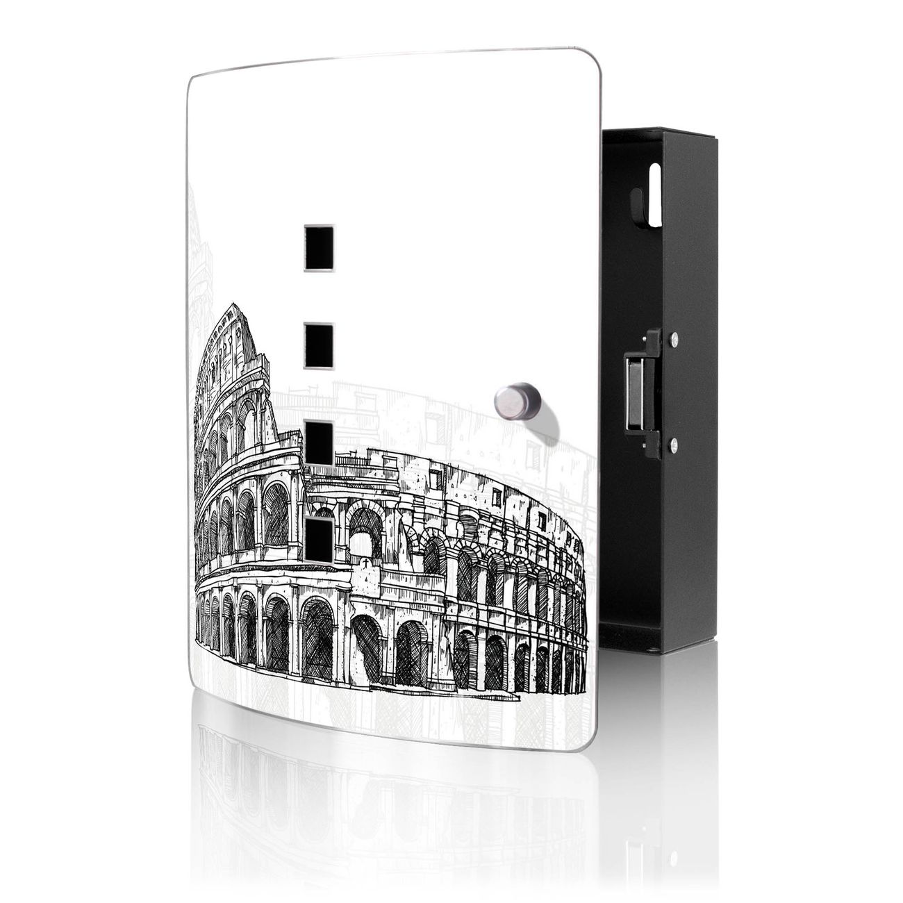 Funktion / Nutzen: Die leicht geschwungene Edelstahltür ist mit einer hochwertigen Motivfolie und dem Motiv Motiv Römisches Kolosseum kaschiert. Ein praktischer Magnetverschluss ermöglicht Ihnen ein schnelles Öffnen und Schließen. Befestigt wird der Schlüsselkasten an 2 Stellen auf der Rückseite, passendes Montagematerial fügen wir bereits bei.