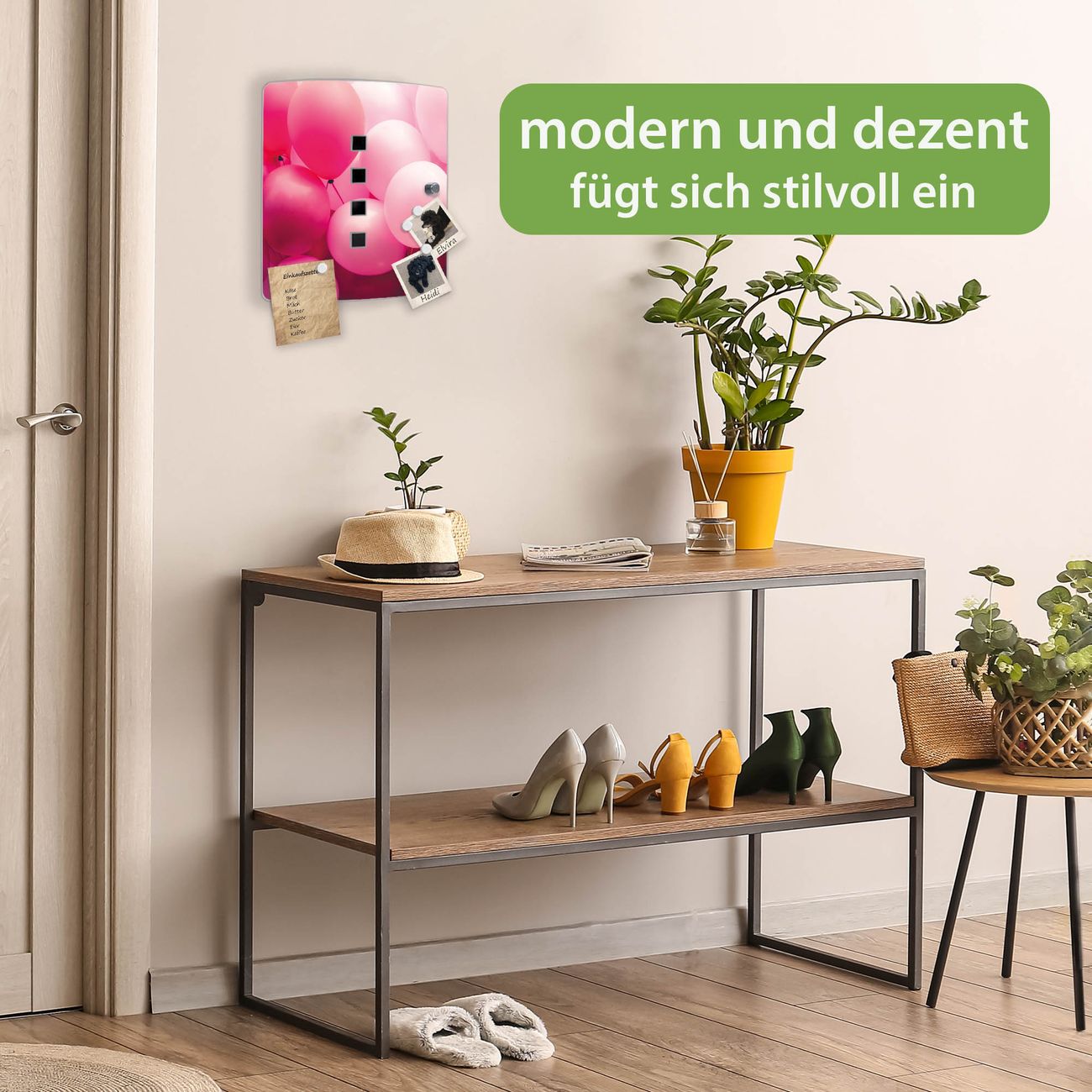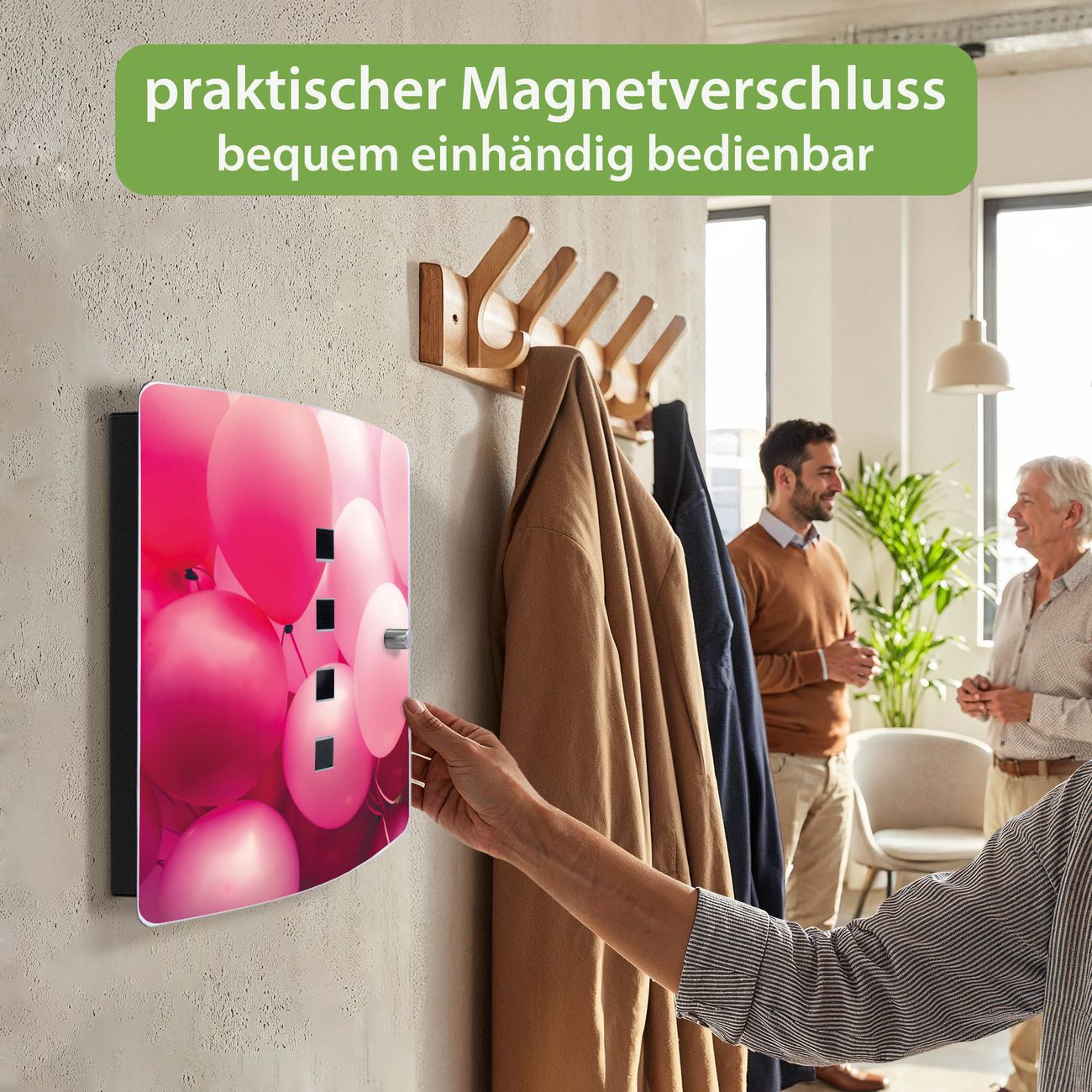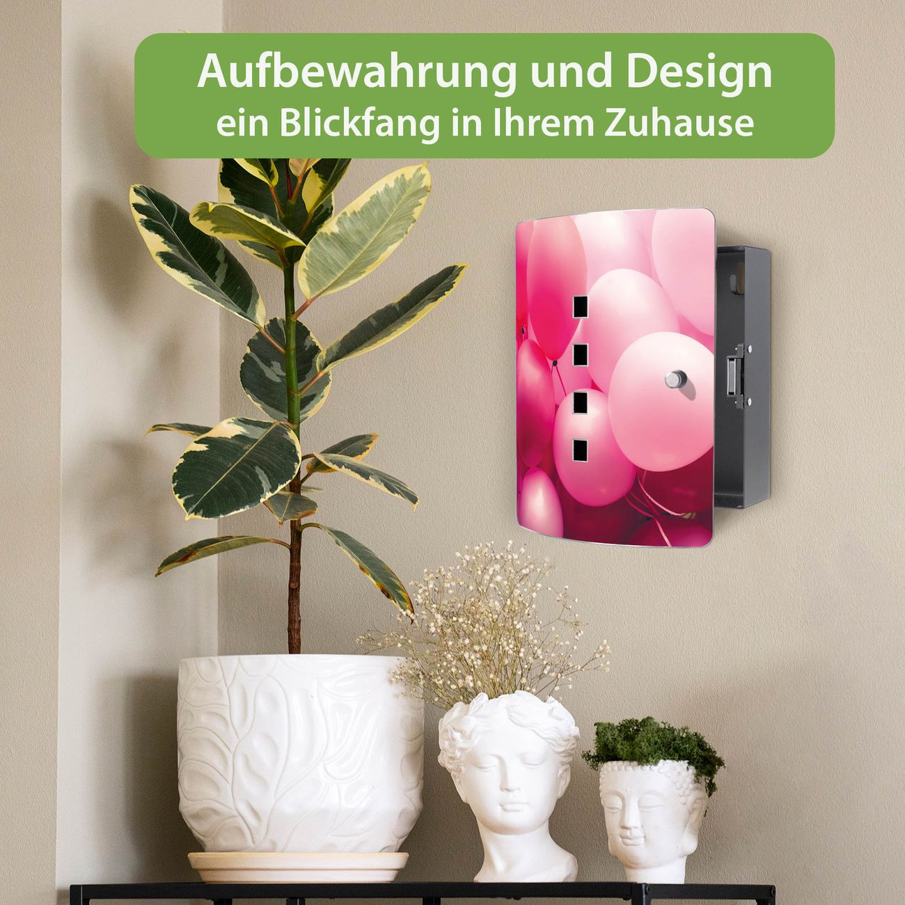 Funktion / Nutzen: Die leicht geschwungene Edelstahltür ist mit einer hochwertigen Motivfolie und dem Motiv Motiv Rosa Ballons 2 kaschiert. Ein praktischer Magnetverschluss ermöglicht Ihnen ein schnelles Öffnen und Schließen. Befestigt wird der Schlüsselkasten an 2 Stellen auf der Rückseite, passendes Montagematerial fügen wir bereits bei.