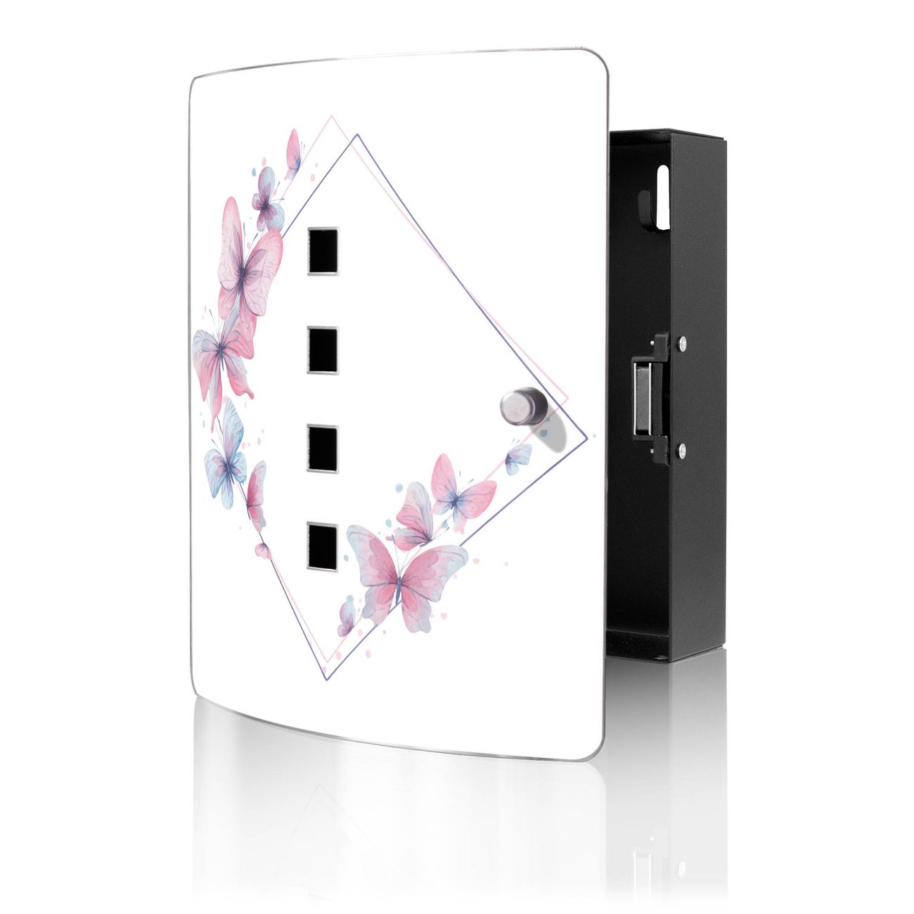 Funktion / Nutzen: Die leicht geschwungene Edelstahltür ist mit einer hochwertigen Motivfolie und dem Motiv Motiv Schmetterlingsgarten 2 kaschiert. Ein praktischer Magnetverschluss ermöglicht Ihnen ein schnelles Öffnen und Schließen. Befestigt wird der Schlüsselkasten an 2 Stellen auf der Rückseite, passendes Montagematerial fügen wir bereits bei.