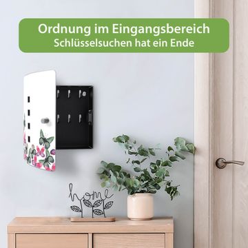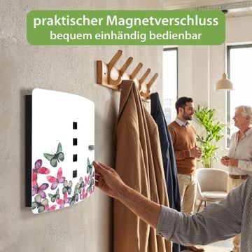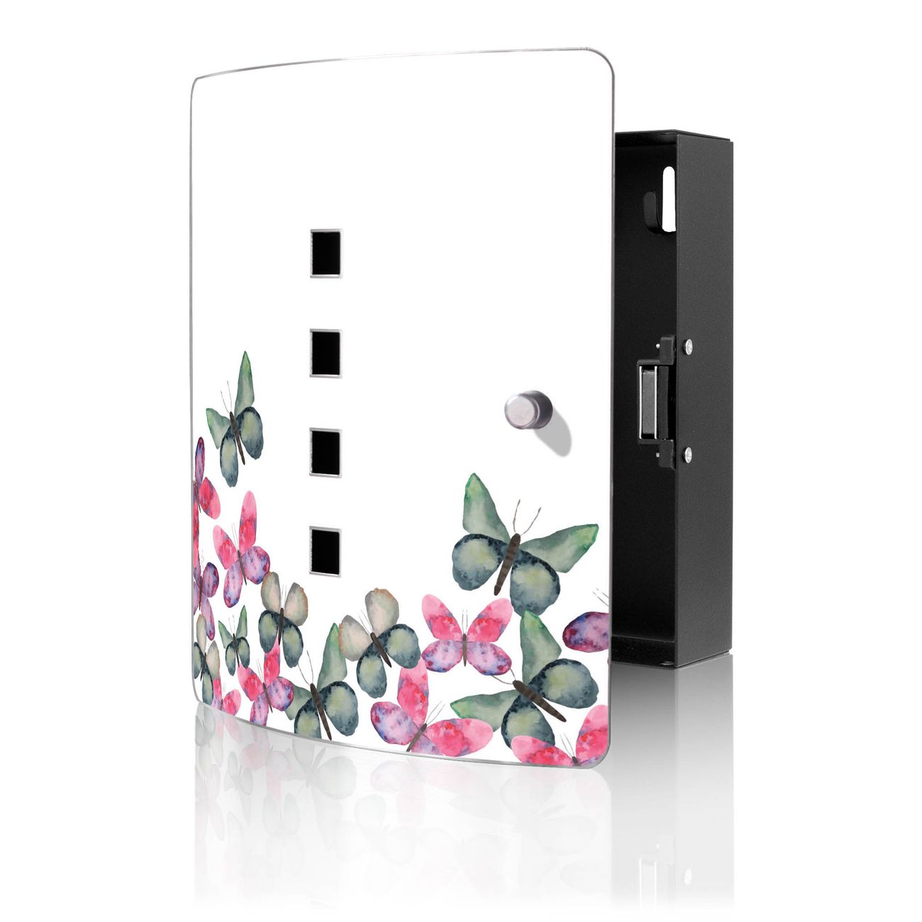 Funktion / Nutzen: Die leicht geschwungene Edelstahltür ist mit einer hochwertigen Motivfolie und dem Motiv Motiv Schmetterlingszauber kaschiert. Ein praktischer Magnetverschluss ermöglicht Ihnen ein schnelles Öffnen und Schließen. Befestigt wird der Schlüsselkasten an 2 Stellen auf der Rückseite, passendes Montagematerial fügen wir bereits bei.