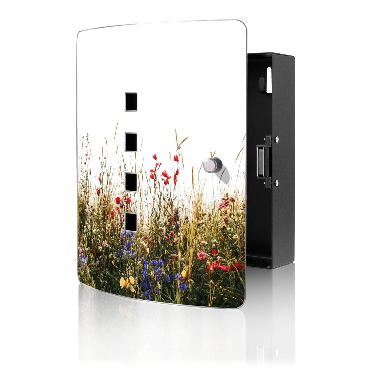 Funktion / Nutzen: Die leicht geschwungene Edelstahltür ist mit einer hochwertigen Motivfolie und dem Motiv Motiv Sommerliche Blumenwiese kaschiert. Ein praktischer Magnetverschluss ermöglicht Ihnen ein schnelles Öffnen und Schließen. Befestigt wird der Schlüsselkasten an 2 Stellen auf der Rückseite, passendes Montagematerial fügen wir bereits bei.