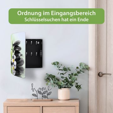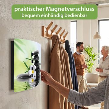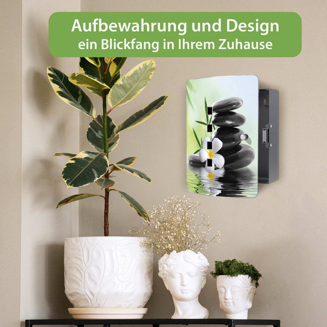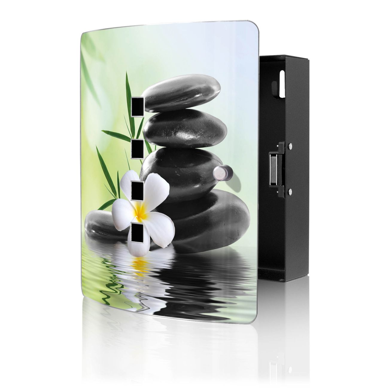 Funktion / Nutzen: Die leicht geschwungene Edelstahltür ist mit einer hochwertigen Motivfolie und dem Motiv Motiv Steine & Relax 6 kaschiert. Ein praktischer Magnetverschluss ermöglicht Ihnen ein schnelles Öffnen und Schließen. Befestigt wird der Schlüsselkasten an 2 Stellen auf der Rückseite, passendes Montagematerial fügen wir bereits bei.