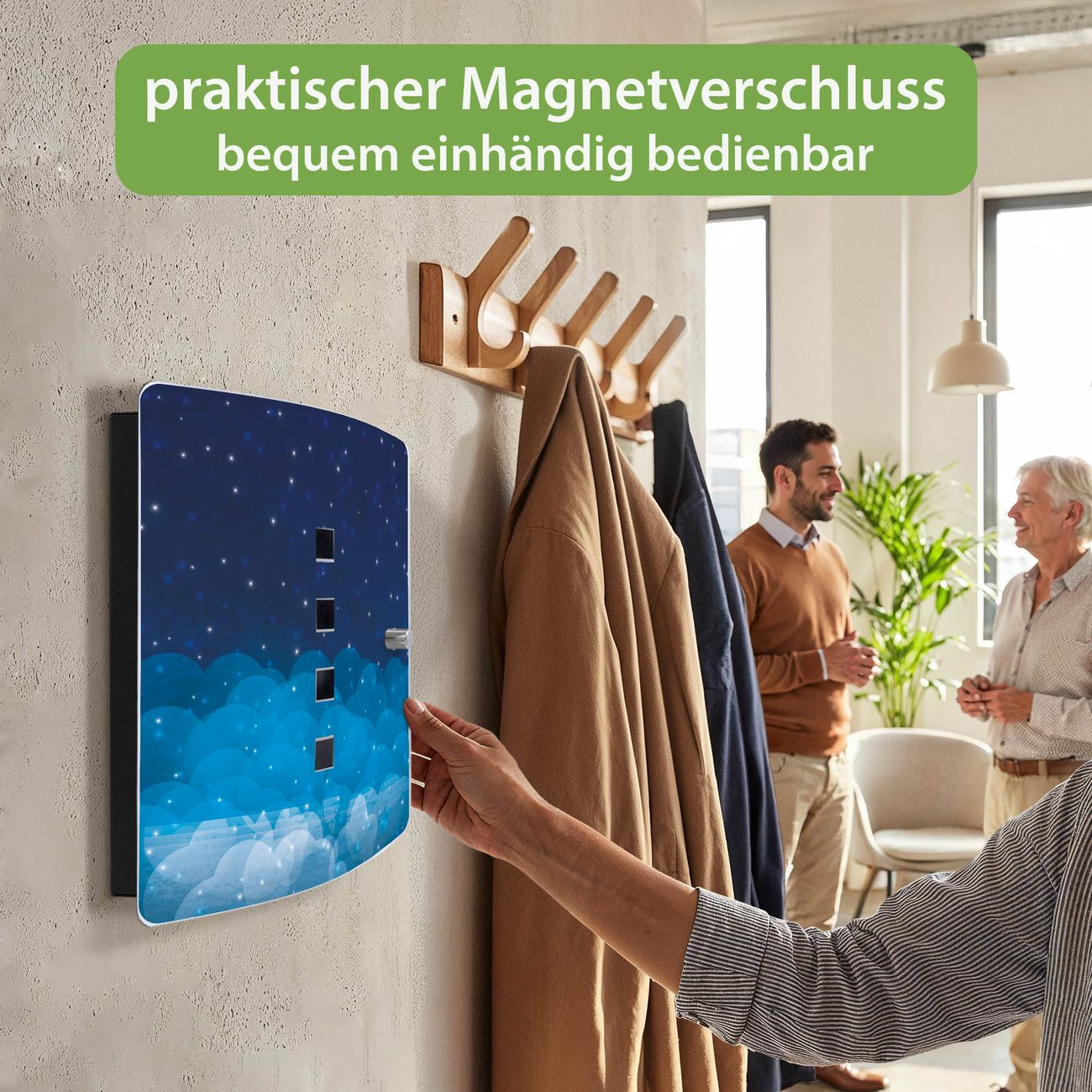 Funktion / Nutzen: Die leicht geschwungene Edelstahltür ist mit einer hochwertigen Motivfolie und dem Motiv Motiv Sternenhimmel 2 kaschiert. Ein praktischer Magnetverschluss ermöglicht Ihnen ein schnelles Öffnen und Schließen. Befestigt wird der Schlüsselkasten an 2 Stellen auf der Rückseite, passendes Montagematerial fügen wir bereits bei.