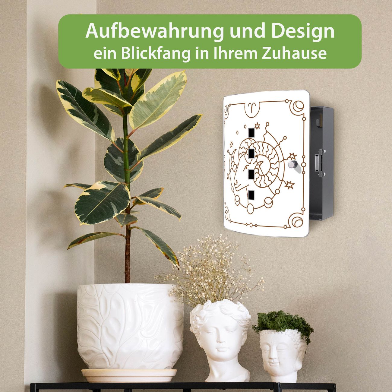 Funktion / Nutzen: Die leicht geschwungene Edelstahltür ist mit einer hochwertigen Motivfolie und dem Motiv Motiv Sternzeichen Widder kaschiert. Ein praktischer Magnetverschluss ermöglicht Ihnen ein schnelles Öffnen und Schließen. Befestigt wird der Schlüsselkasten an 2 Stellen auf der Rückseite, passendes Montagematerial fügen wir bereits bei.