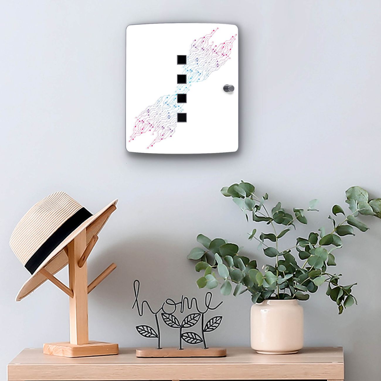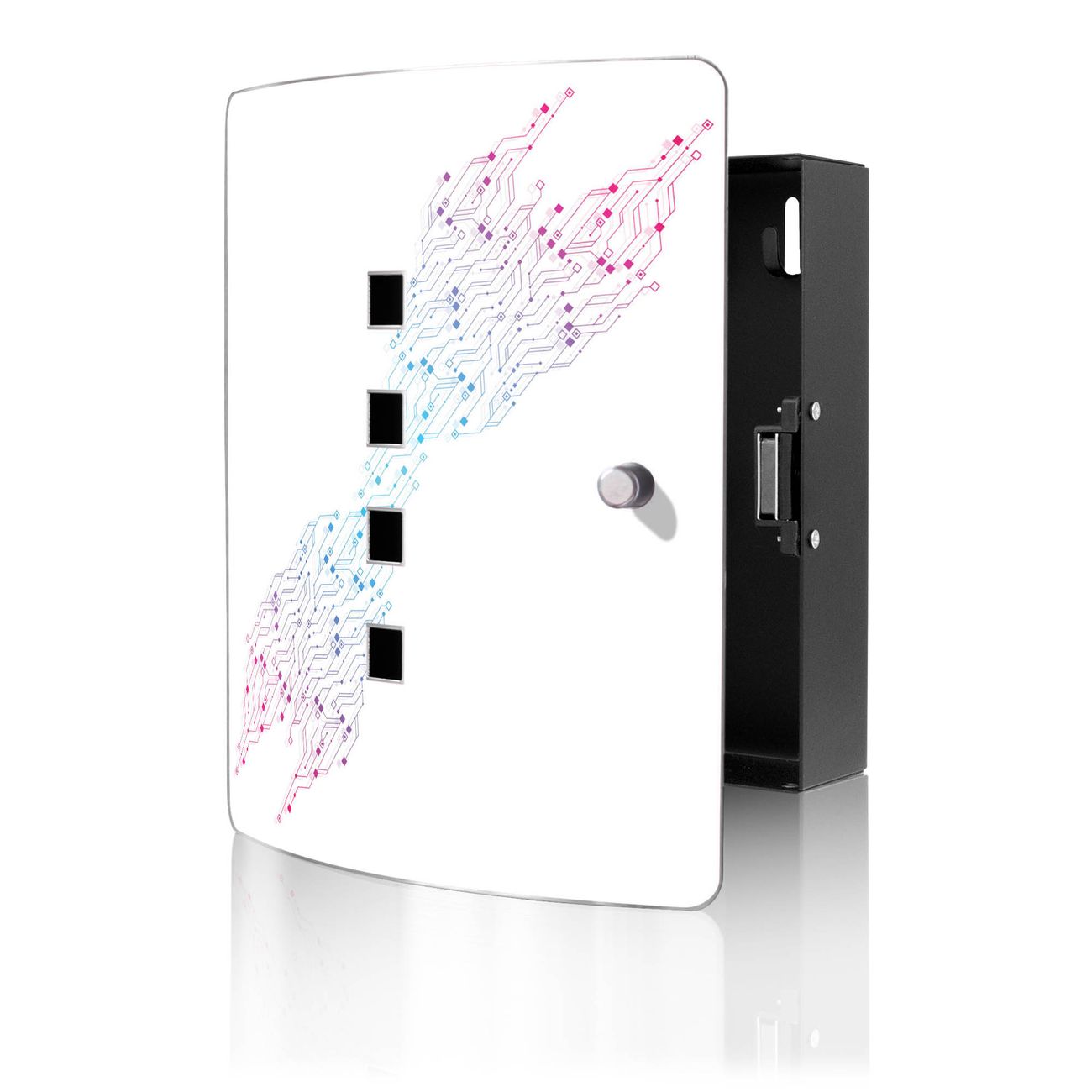 Funktion / Nutzen: Die leicht geschwungene Edelstahltür ist mit einer hochwertigen Motivfolie und dem Motiv Motiv Technologiemuster kaschiert. Ein praktischer Magnetverschluss ermöglicht Ihnen ein schnelles Öffnen und Schließen. Befestigt wird der Schlüsselkasten an 2 Stellen auf der Rückseite, passendes Montagematerial fügen wir bereits bei.