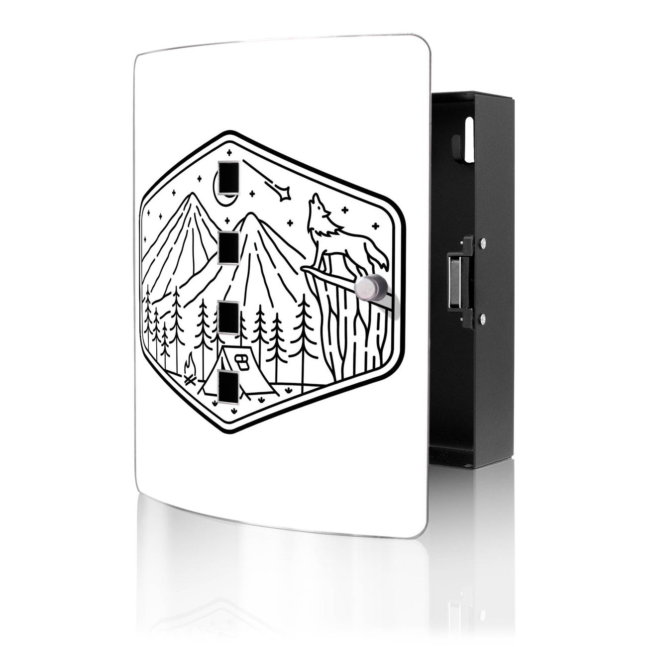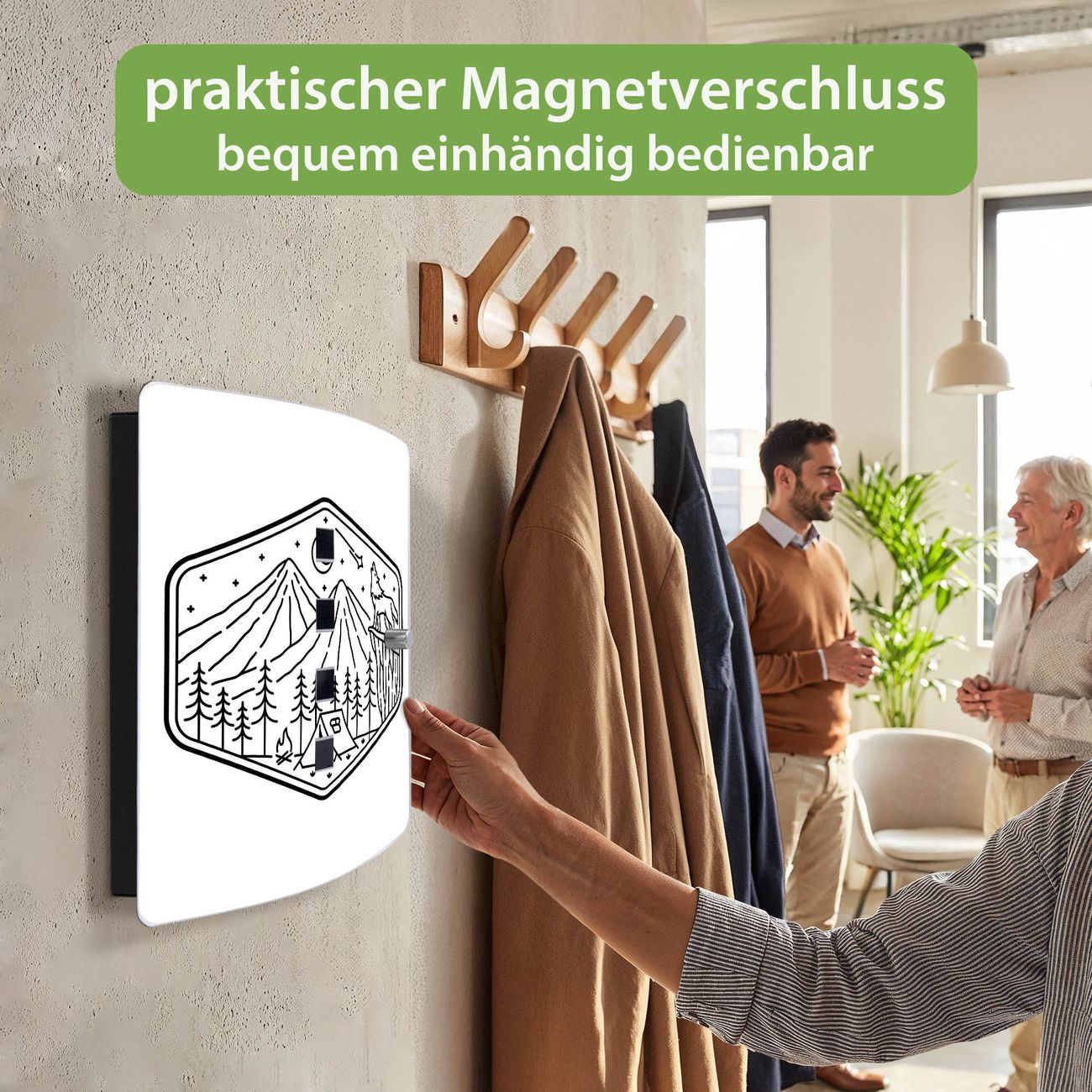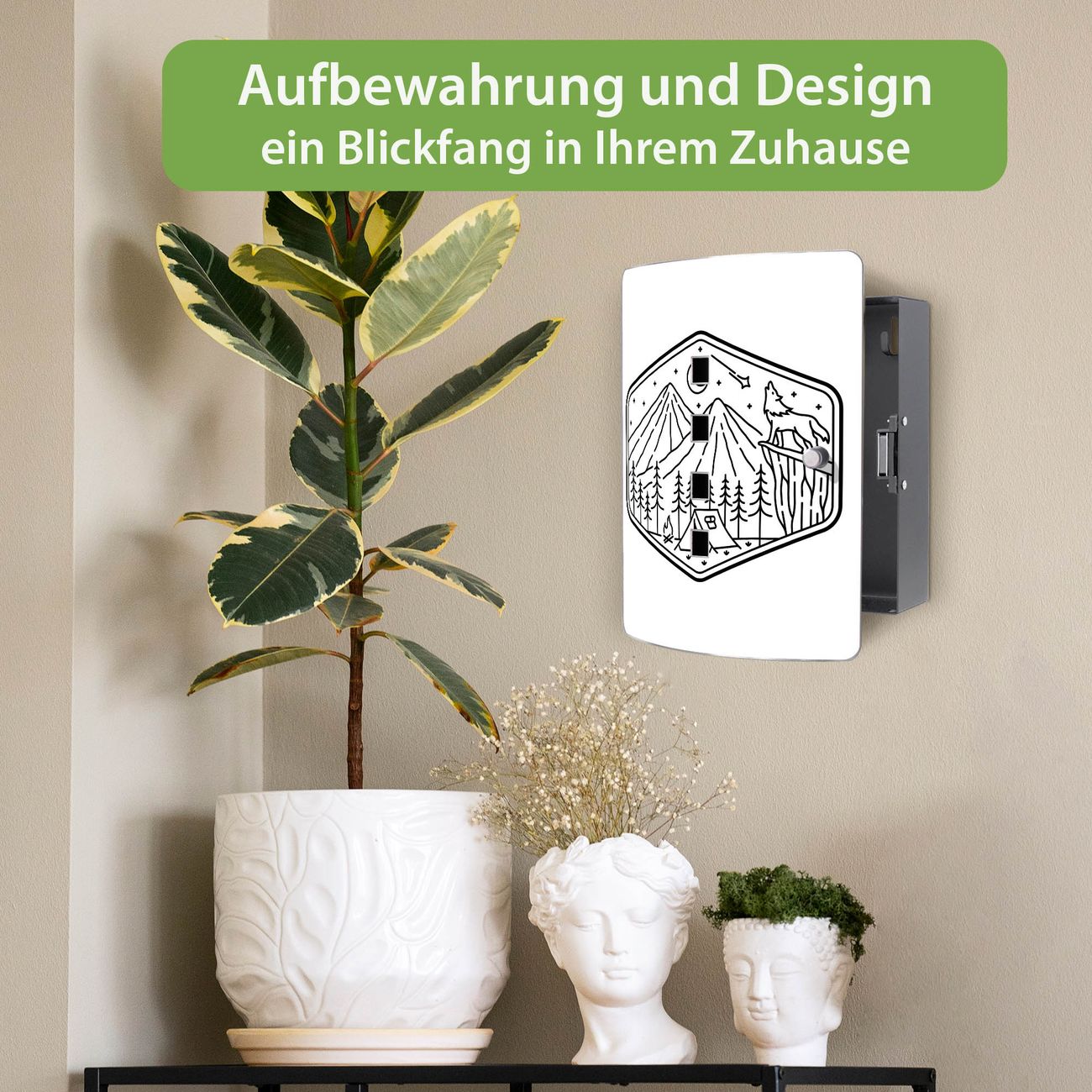 Funktion / Nutzen: Die leicht geschwungene Edelstahltür ist mit einer hochwertigen Motivfolie und dem Motiv Motiv Vignette Landschaft kaschiert. Ein praktischer Magnetverschluss ermöglicht Ihnen ein schnelles Öffnen und Schließen. Befestigt wird der Schlüsselkasten an 2 Stellen auf der Rückseite, passendes Montagematerial fügen wir bereits bei.