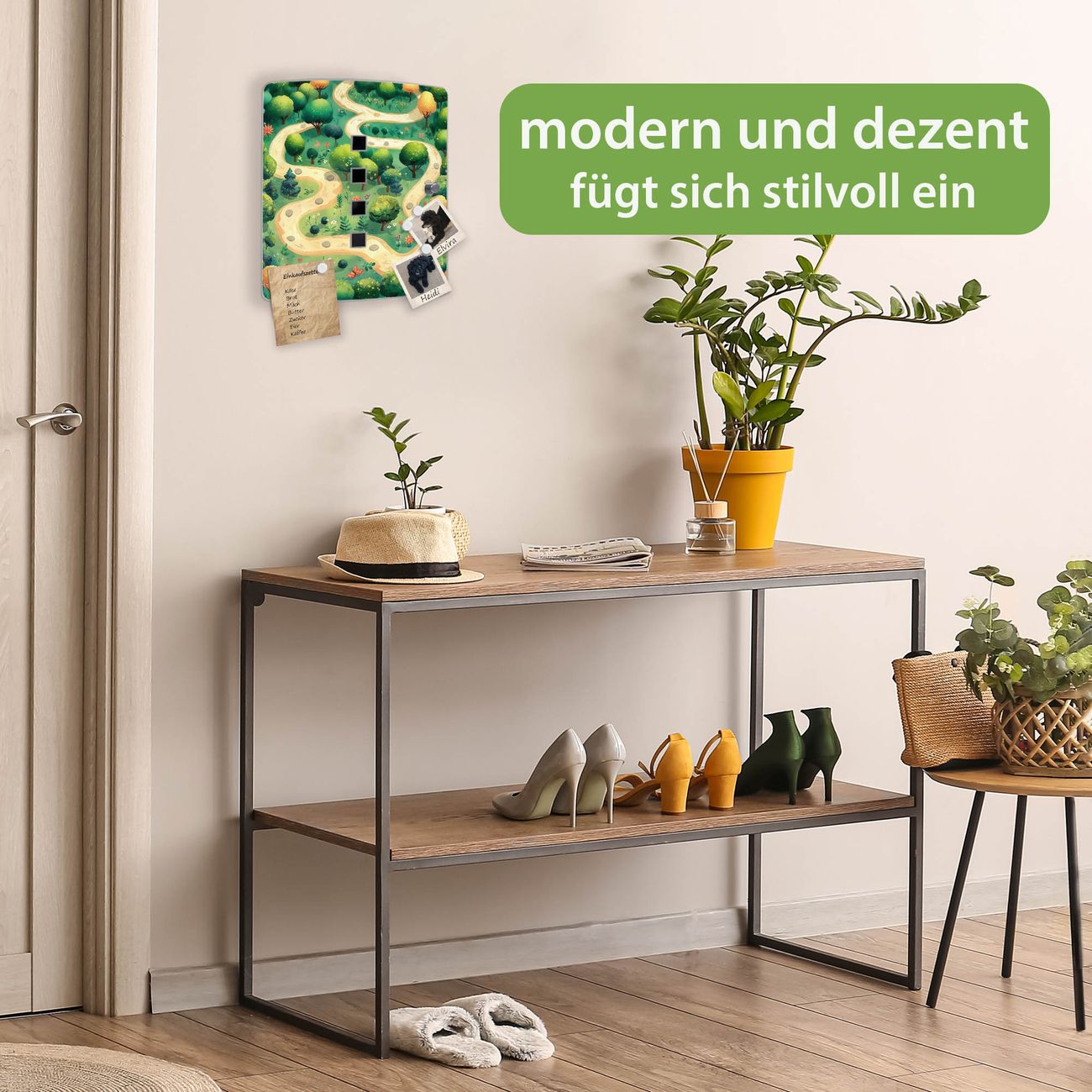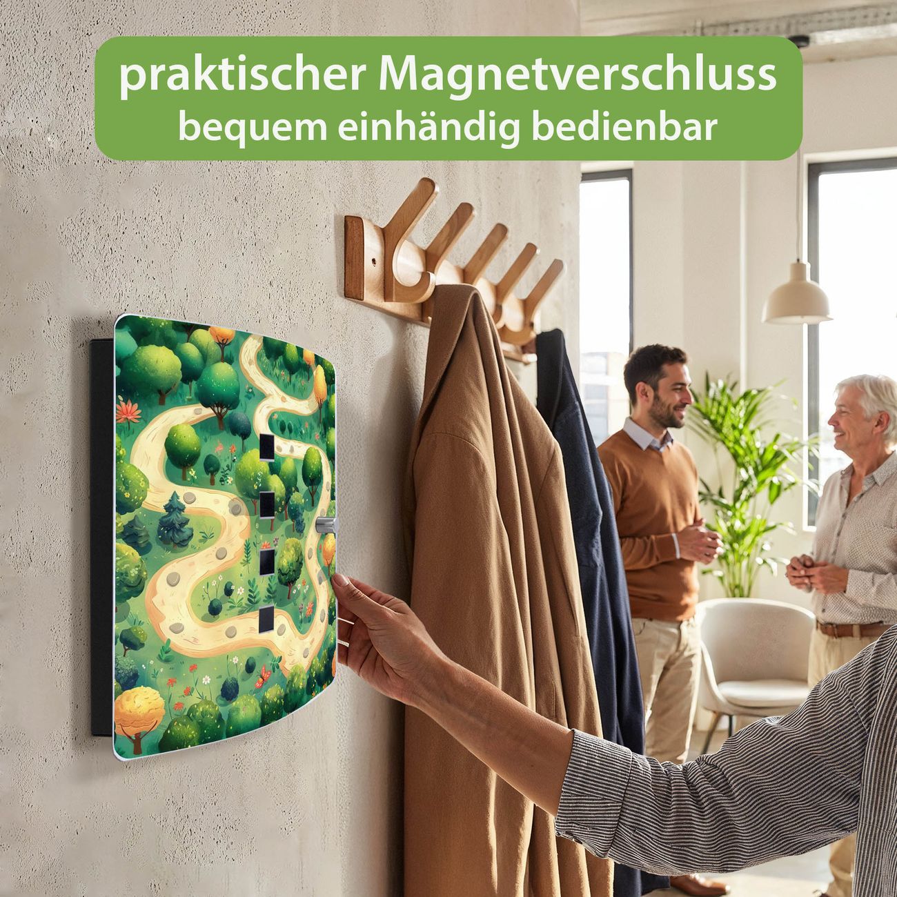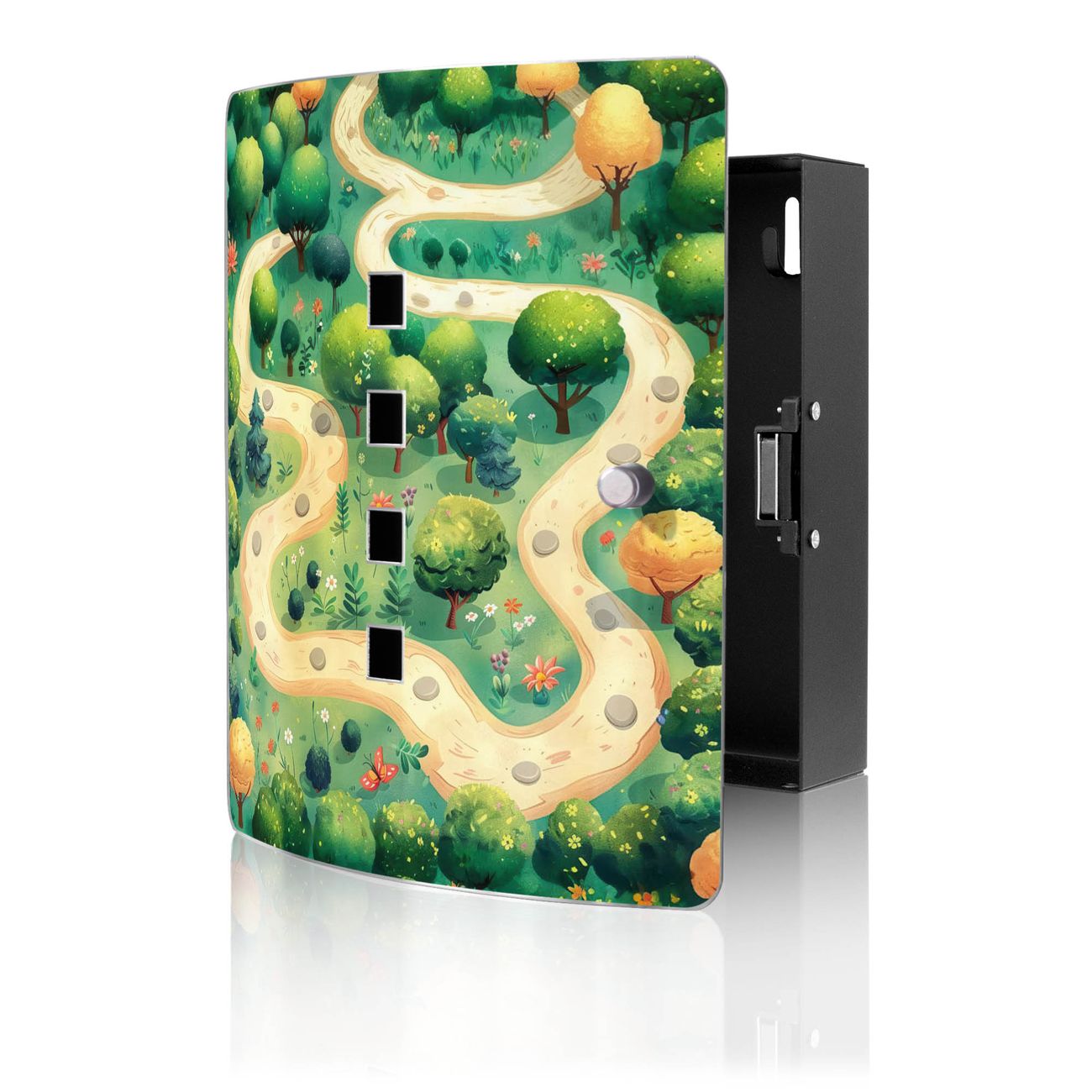 Funktion / Nutzen: Die leicht geschwungene Edelstahltür ist mit einer hochwertigen Motivfolie und dem Motiv Motiv Waldweg kaschiert. Ein praktischer Magnetverschluss ermöglicht Ihnen ein schnelles Öffnen und Schließen. Befestigt wird der Schlüsselkasten an 2 Stellen auf der Rückseite, passendes Montagematerial fügen wir bereits bei.